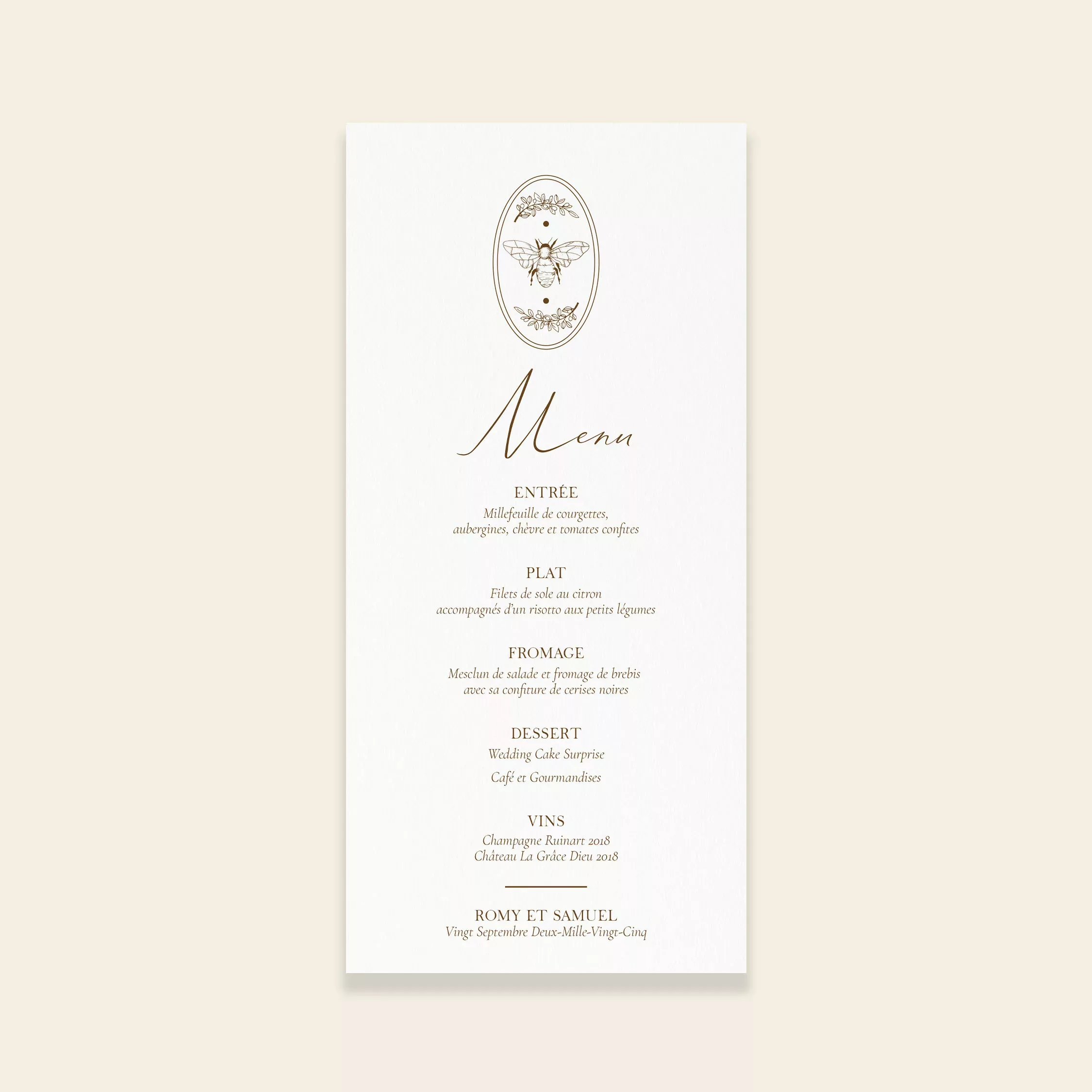 Le menu, pièce incontournable à la bonne organisation de votre mariage, vient apporter une touche supplémentaire à l’harmonie de votre table. Mais surtout, il annoncera les réjouissances gustatives. Il est à installer à la place de chaque convive ou bien au centre de la table.