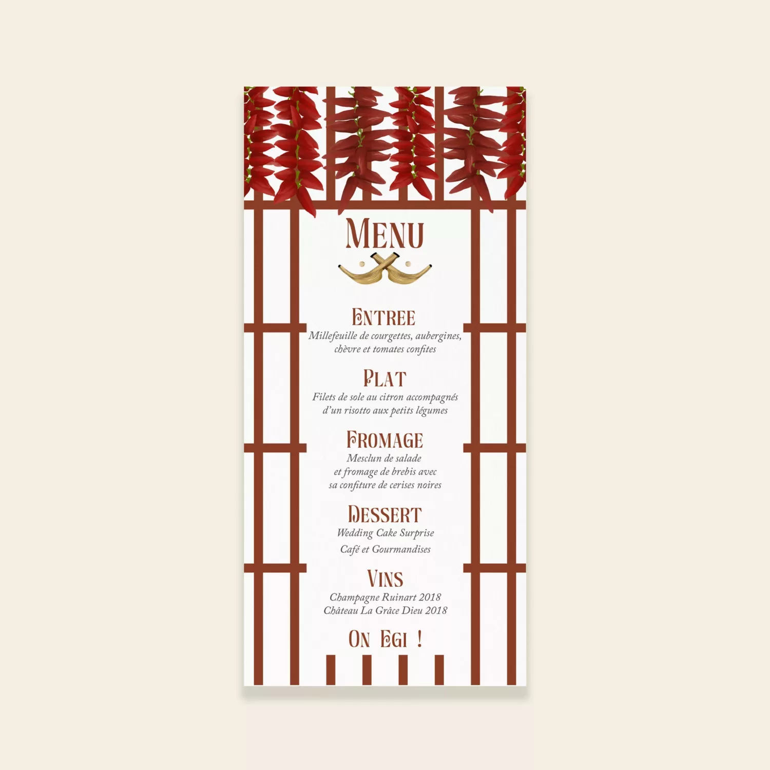 Menu de la collection PAYS-BASQUE issue de la gamme mariage du studio. Découvrez la collection « Pays Basque » de Maison Célestine, une gamme exclusive de papeterie de mariage inspirée par la beauté et l’authenticité de la région du Pays Basque. Parfaite pour les mariages qui célèbrent l’âme basque, cette collection allie tradition et modernité avec des designs raffinés, des motifs élégants, et une attention minutieuse aux détails.