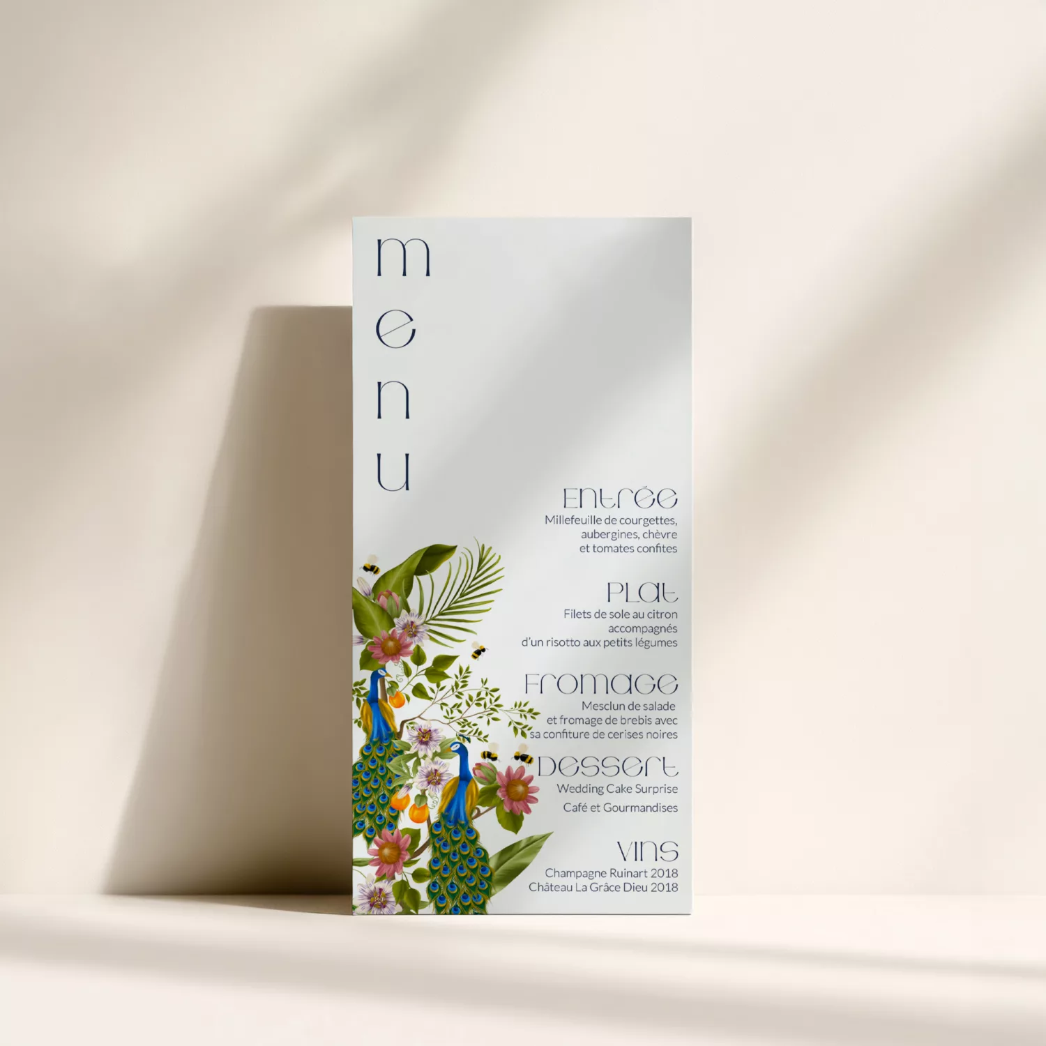 Du faire-part aux menus, en passant par les cartes RSVP et les remerciements, chaque élément reprend les motifs de paon et les illustrations florales.