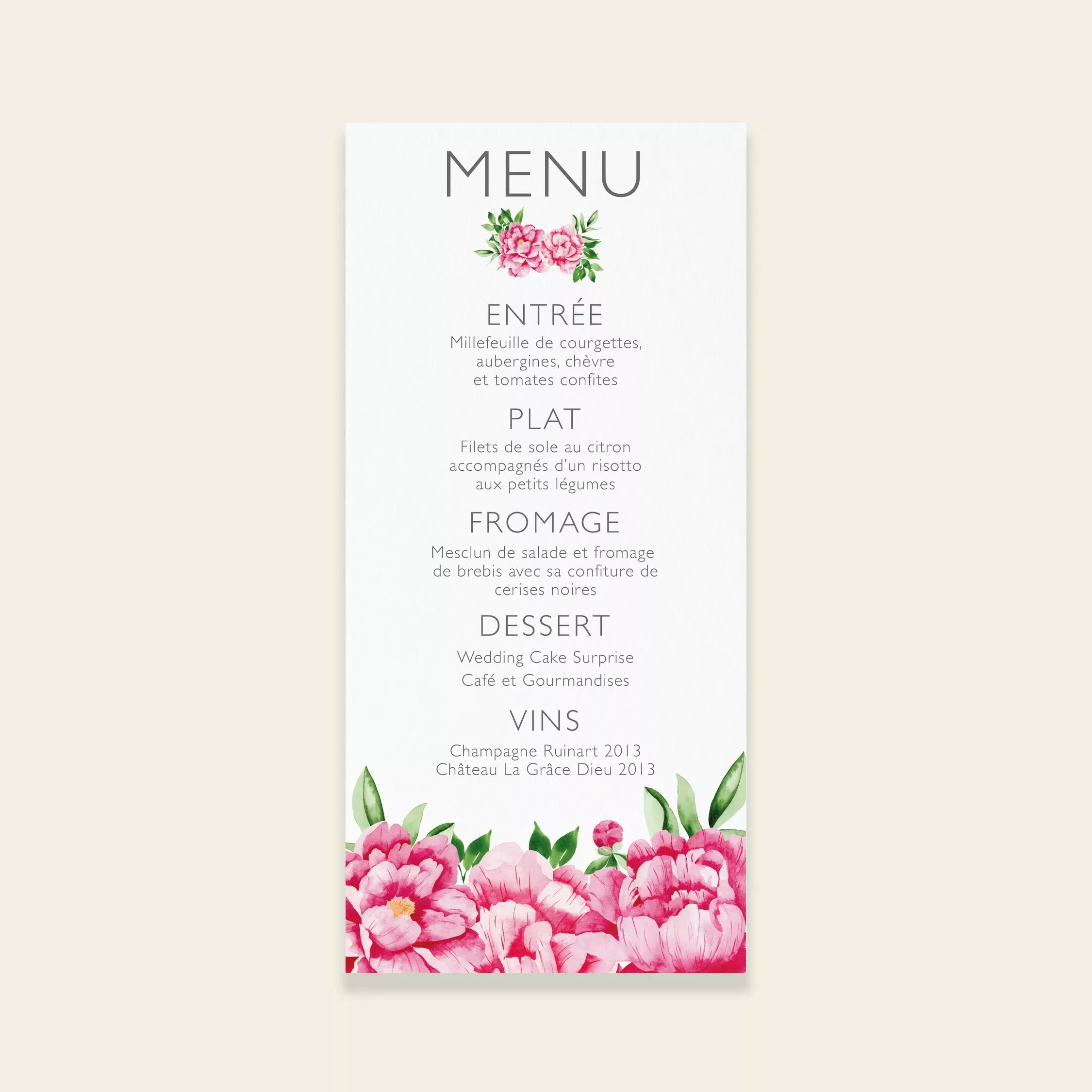 Menu de la collection PIVOINES ROMANTIQUES issue de la gamme mariage du studio.