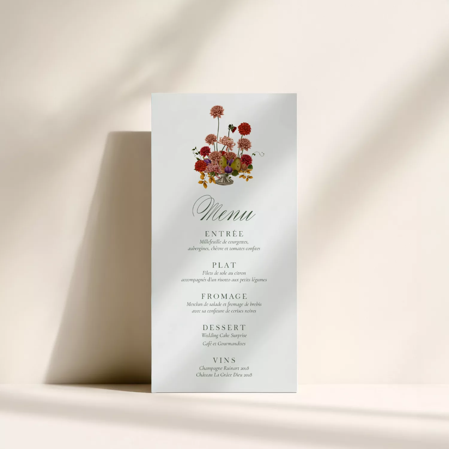 Présentez le repas de votre mariage avec élégance grâce à un menu personnalisé. Ce support complète votre papeterie et guide vos invités à travers chaque étape du repas. Il ajoute une touche raffinée et cohérente à votre table.