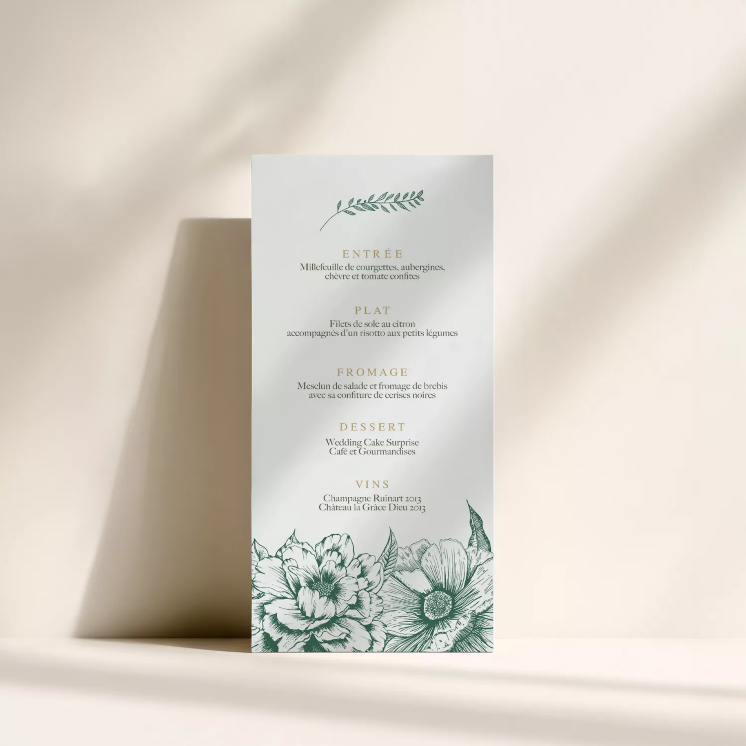 Du faire-part aux menus, en passant par les cartes RSVP et les remerciements, chaque élément reprend les illustrations florales de la collection.