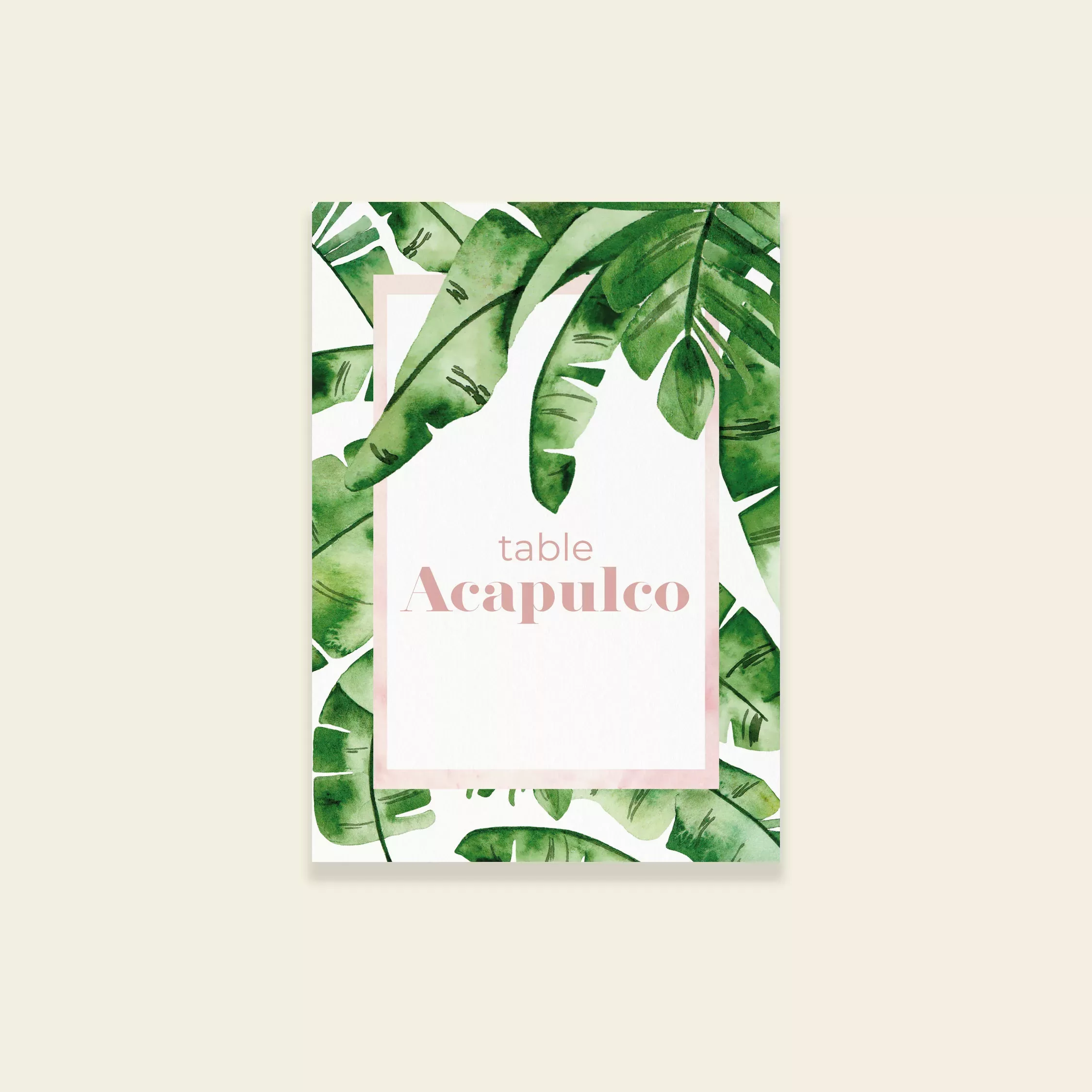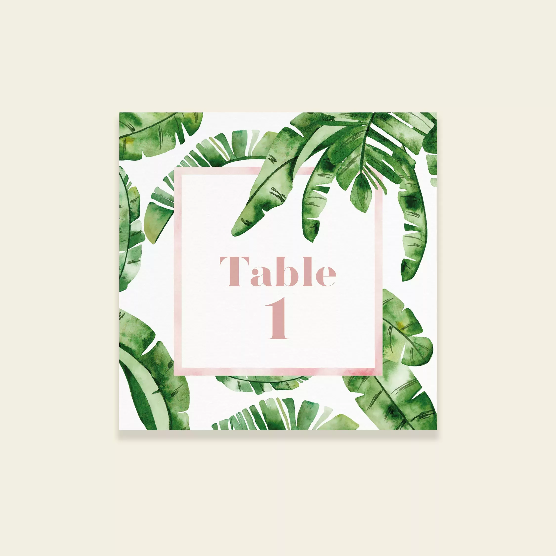 Numéro / Nom de table de la collection BANANA LIFE issue de la gamme mariage du studio. « Banana Life » s’inspire d’un univers tropical et exotique. La végétation est rehaussée par des touches de rose. Les feuilles de bananiers sont mixées avec une écriture graphique pour une papeterie moderne et tendance. Cette collection, entièrement peinte à la main par la créatrice est idéale pour les mariages à l’esprit d’évasion, bohème et éclectique.