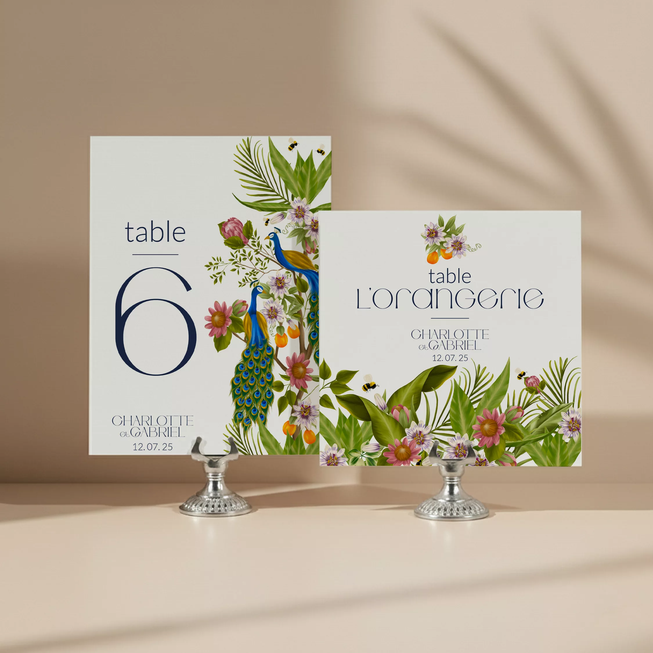 Facilitez l’organisation de votre réception avec des numéros ou noms de table personnalisés. Ces éléments pratiques s’intègrent parfaitement à votre papeterie et guident vos invités. Ils apportent une touche harmonieuse et raffinée à votre décoration de table. La collection Peacock Garden célèbre les mariages colorés et élégants. Elle s’inspire de la beauté des plumes de paon et des jardins luxuriants.Les illustrations mêlent fleurs tropicales et motifs de paon.Les couleurs profondes et lumineuses créent une papeterie pleine de caractère. Ainsi, chaque carton devient une véritable introduction à votre célébration.