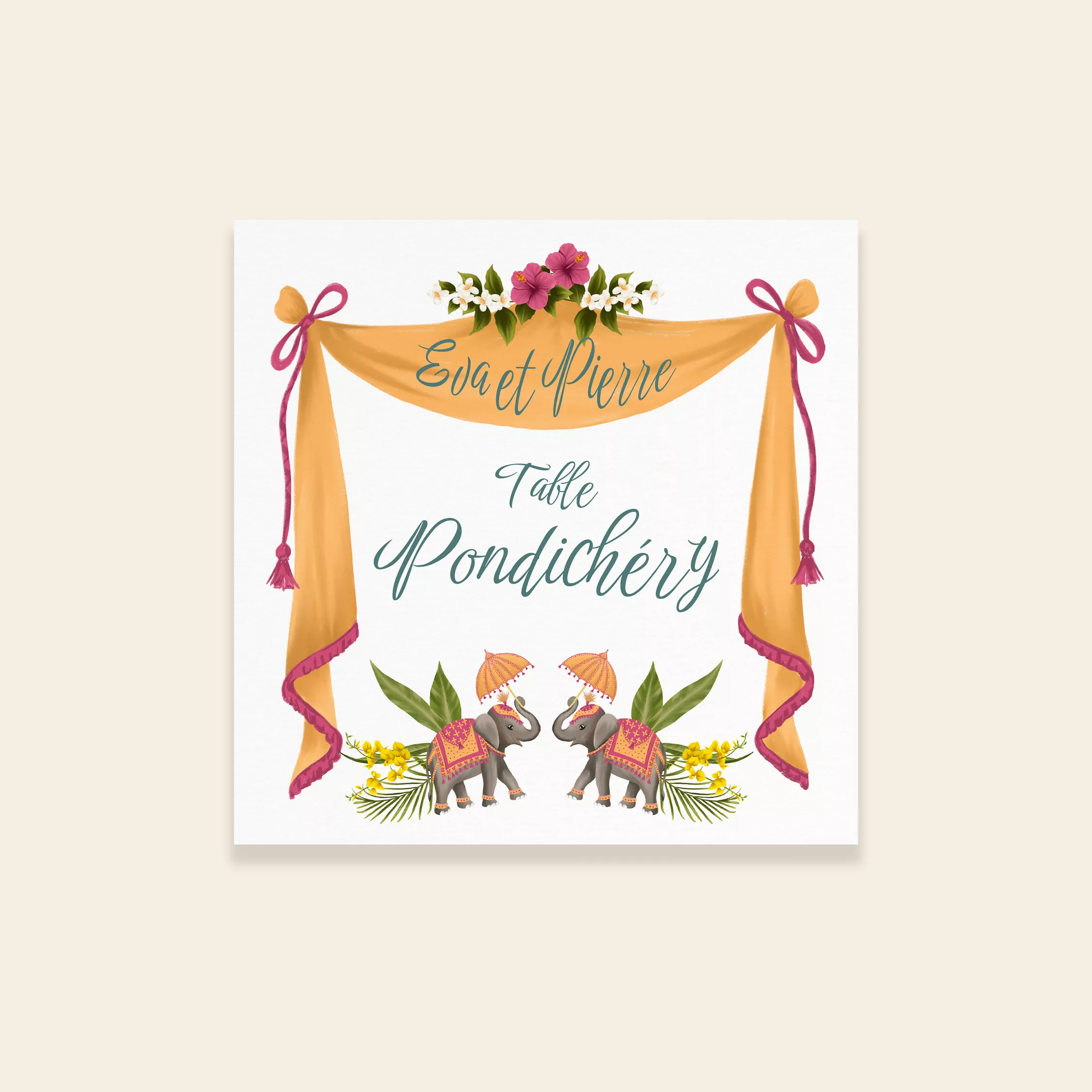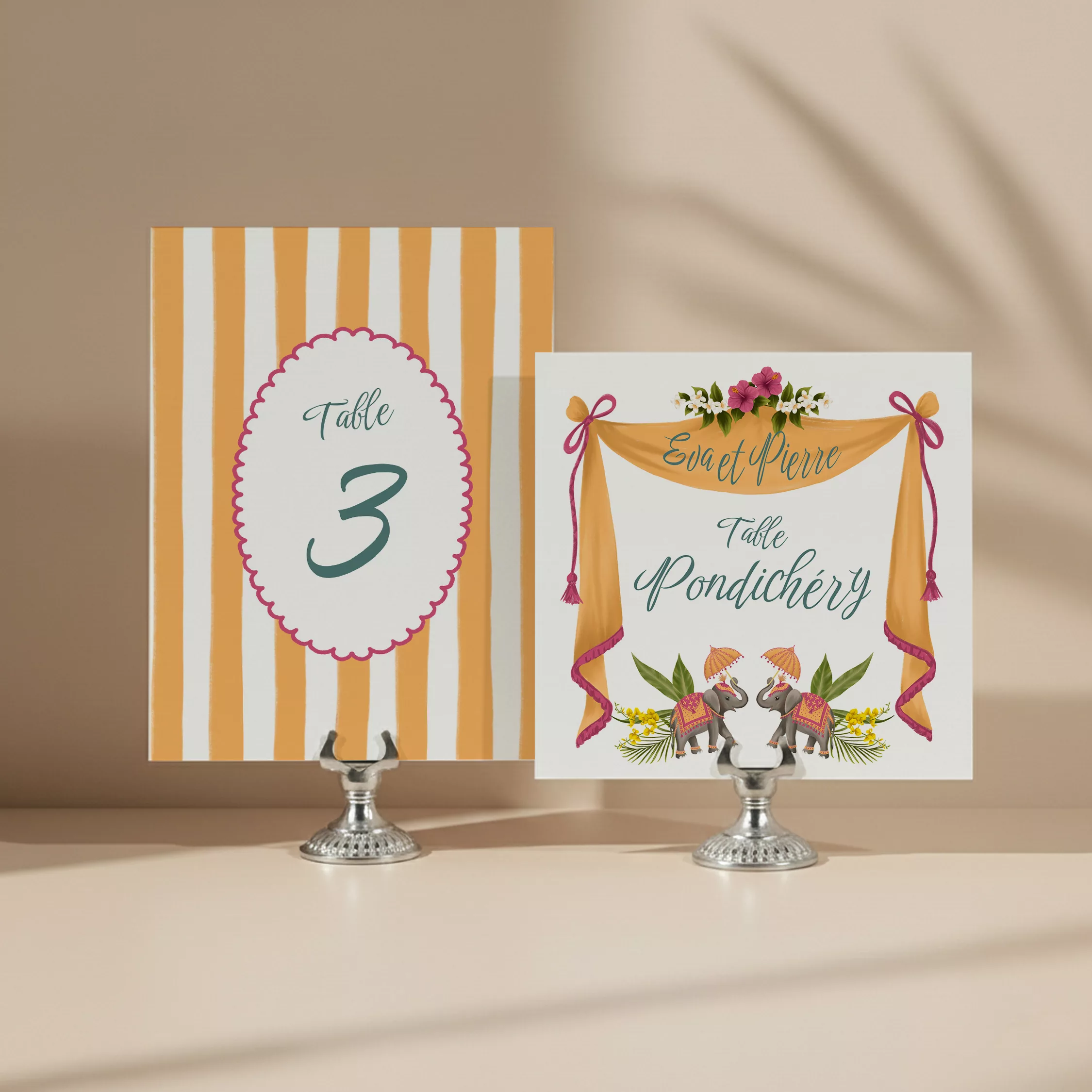 Facilitez l’organisation de votre réception avec des numéros ou noms de table personnalisés. Ces éléments pratiques s’intègrent parfaitement à votre papeterie et guident vos invités. Ils apportent une touche harmonieuse et raffinée à votre décoration de table. La collection Jaipur apporte de l’éclat à votre mariage. En effet, ce modèle s’inspire des jardins orientaux et des fêtes traditionnelles. Il combine des fleurs luxuriantes avec des éléphants de parade. De plus, des détails fantaisistes créent un ensemble harmonieux. Les nuances de rose et de jaune safran diffusent une énergie solaire. Ainsi, votre papeterie devient une véritable invitation au voyage.