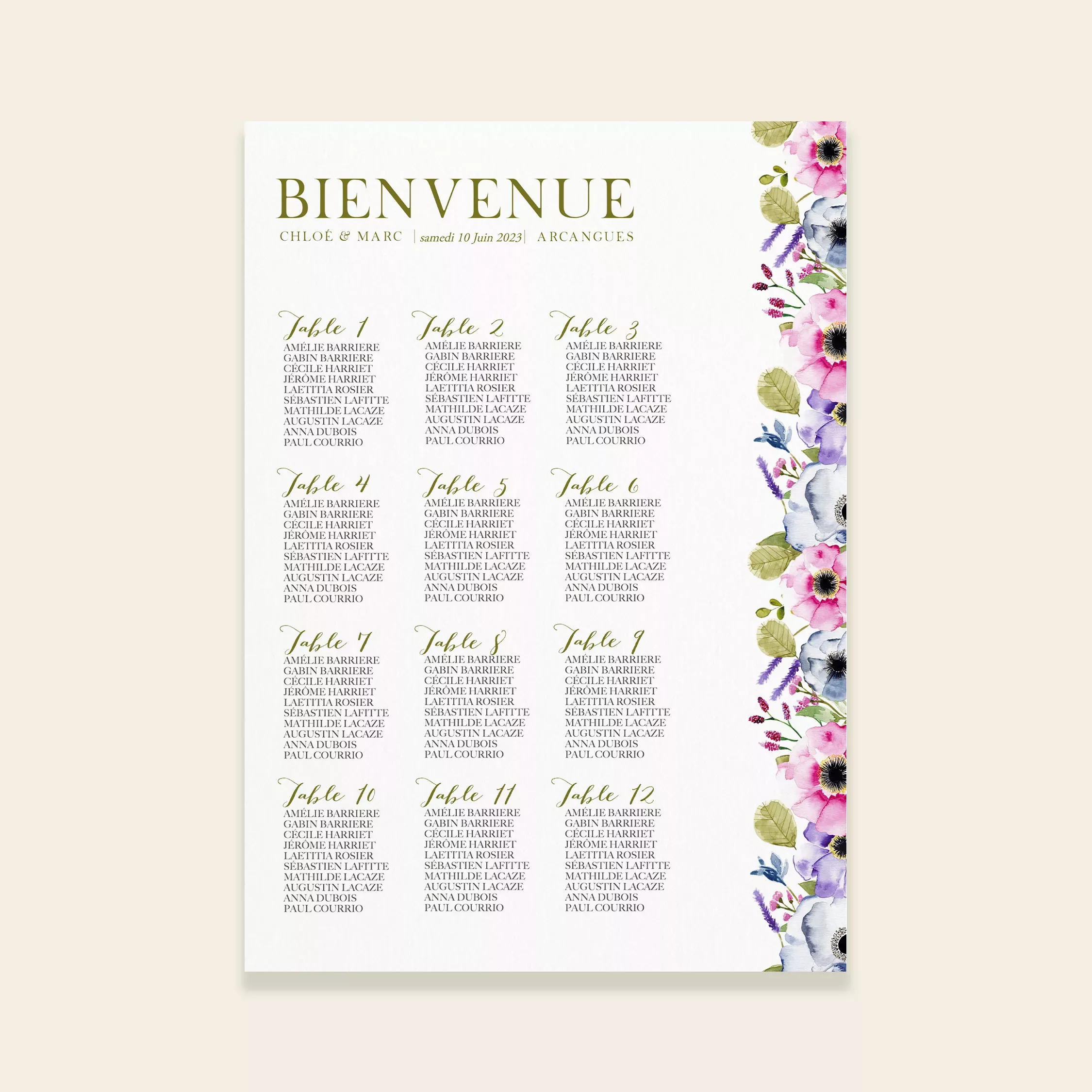 Pour un repas organisé le plan de table est indispensable pour que vos invités trouvent leurs places. Il est à encadrer afin d’indiquer à vos convives à quel endroit s’installer à table. Complétez votre papeterie de mariage avec ce plan de table au format A2 afin que votre décoration soit toute en poésie !
