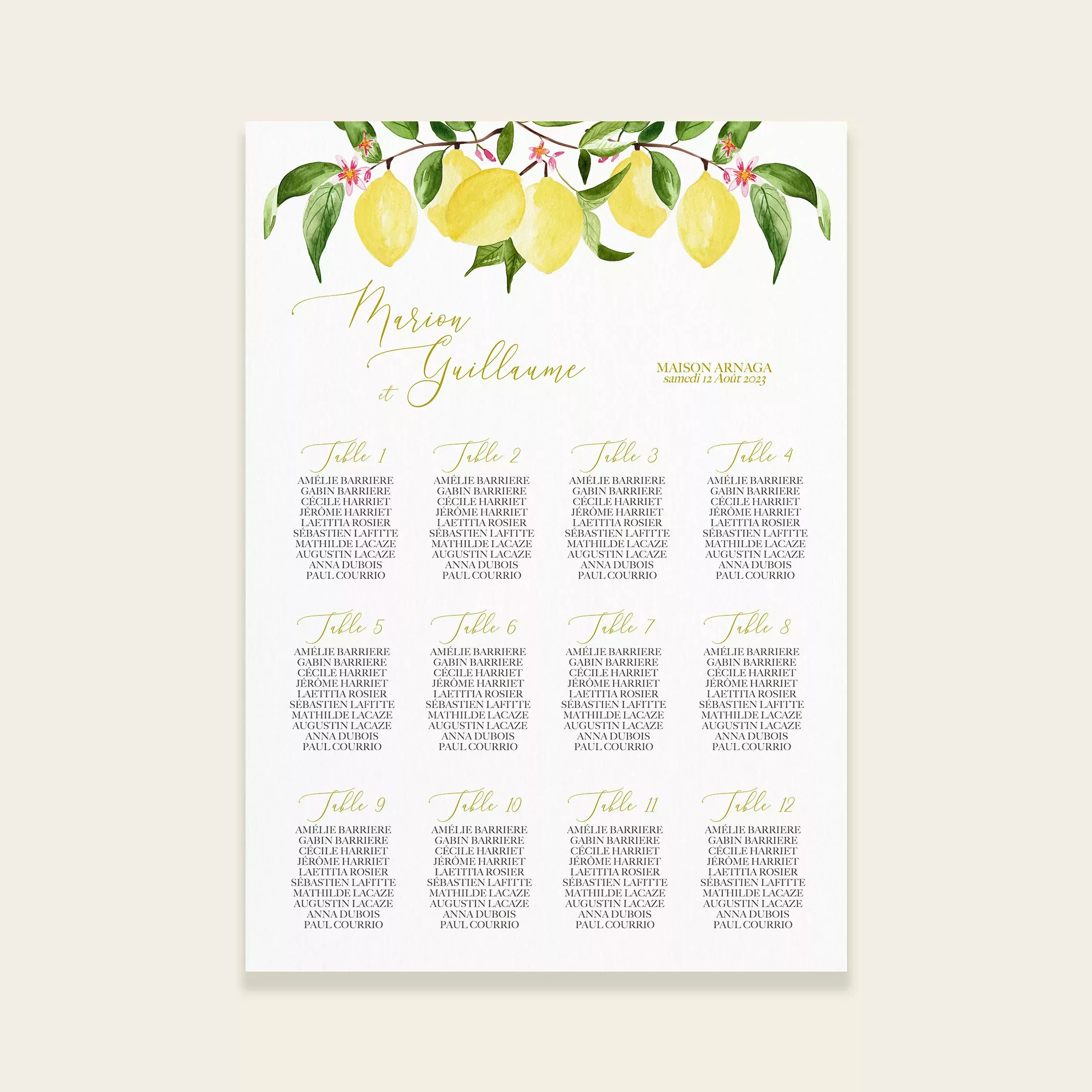 Plan de table A2 de la collection UN AMOUR DE CITRON issu de la gamme mariage du studio. “Un amour de citron” est un joli design, entièrement peint à la main à l’aquarelle par la créatrice. Une papeterie mettant en scène des citrons et leurs branchages et qui inspirent le printemps et l’été. Une collection pleine de soleil qui mêle des tons de jaune et de vert. Une papeterie botanique, colorée, idéale pour les mariages à l’esprit bohème et nature.