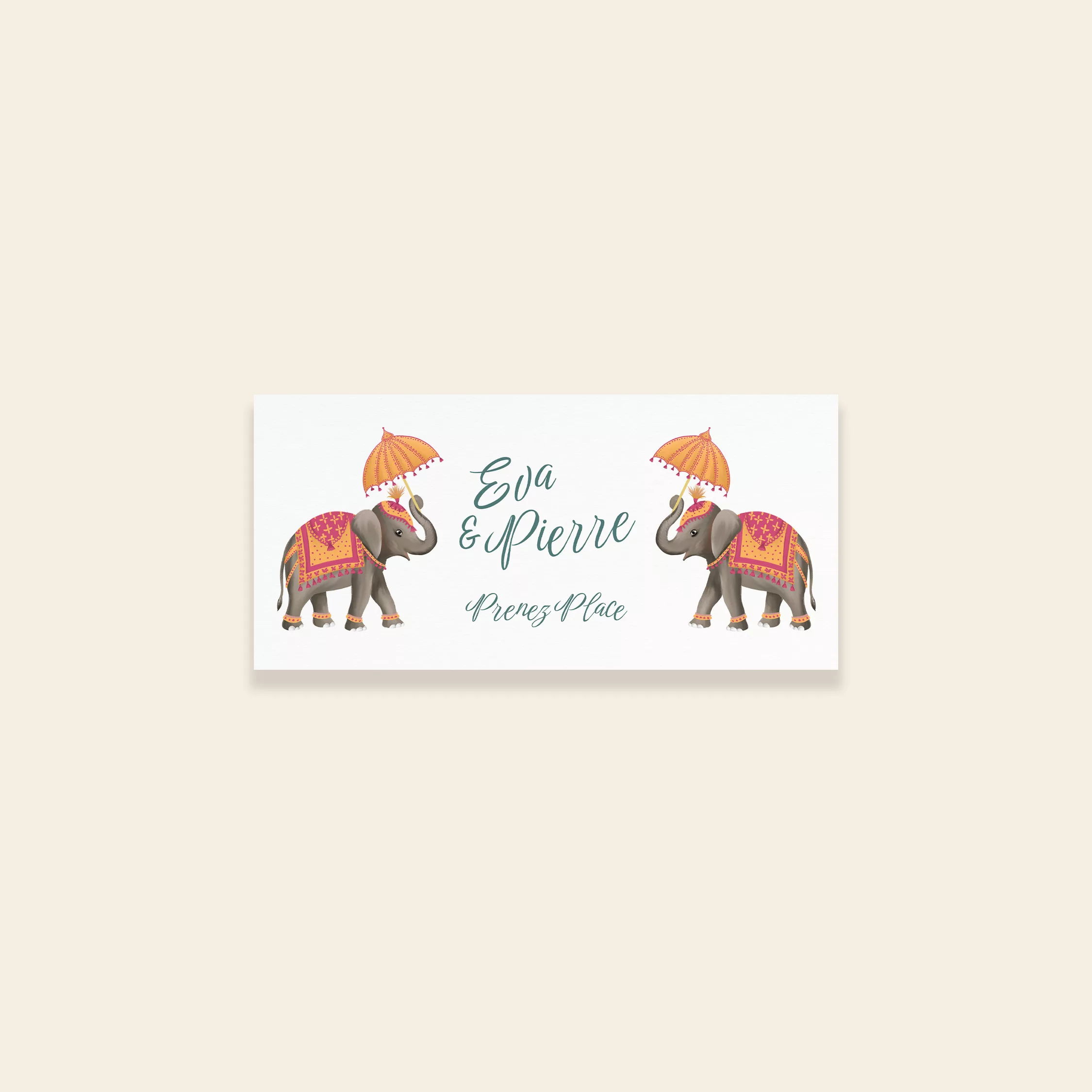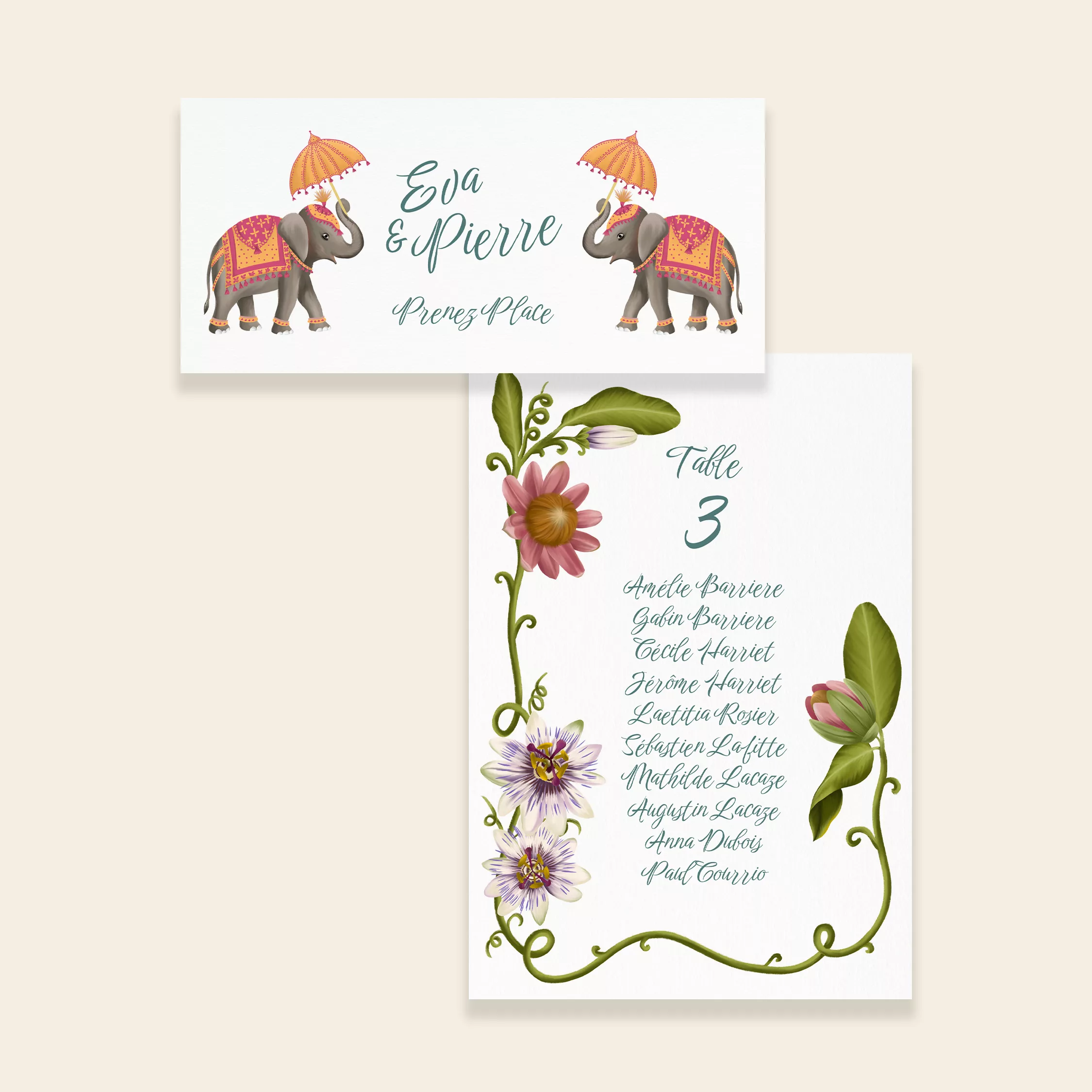 Organisez l’accueil de vos invités avec élégance grâce à nos plans de table personnalisés, conçus pour harmoniser votre décoration et guider chacun avec style lors de votre grand jour. La collection Jaipur apporte de l’éclat à votre mariage. En effet, ce modèle s’inspire des jardins orientaux et des fêtes traditionnelles. Il combine des fleurs luxuriantes avec des éléphants de parade. De plus, des détails fantaisistes créent un ensemble harmonieux. Les nuances de rose et de jaune safran diffusent une énergie solaire. Ainsi, votre papeterie devient une véritable invitation au voyage.