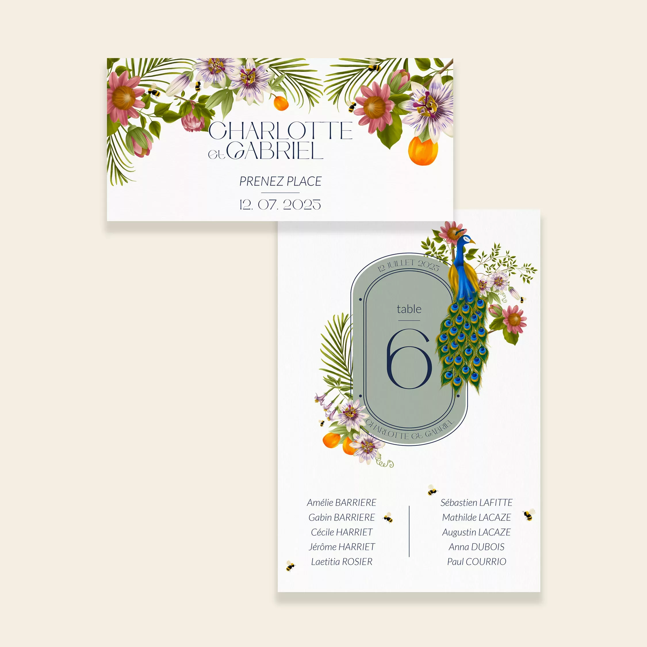 Plan de table de la collection PEACOCK GARDEN issue de la gamme mariage du studio. « Peacock Garden » est une collection inspirée de paysages anciens. Cette invitation au voyage au coeur du jardin des paons, cet animal majestueux aux plumes bleues originaire de l’Inde, est l’occasion de se plonger dans un univers exotique et élégant. Donnez le ton avec cette papeterie de mariage ou faune et flore se mélangent pour une célébration à la fois chic et intemporelle. Peacock Garden est un véritable voyage illustré qui transportera vos invités et qui restera un beau symbole de votre union. Cette collection, entièrement peinte à la main par la créatrice est idéale pour les mariages à l’esprit nature, moderne et élégant.
