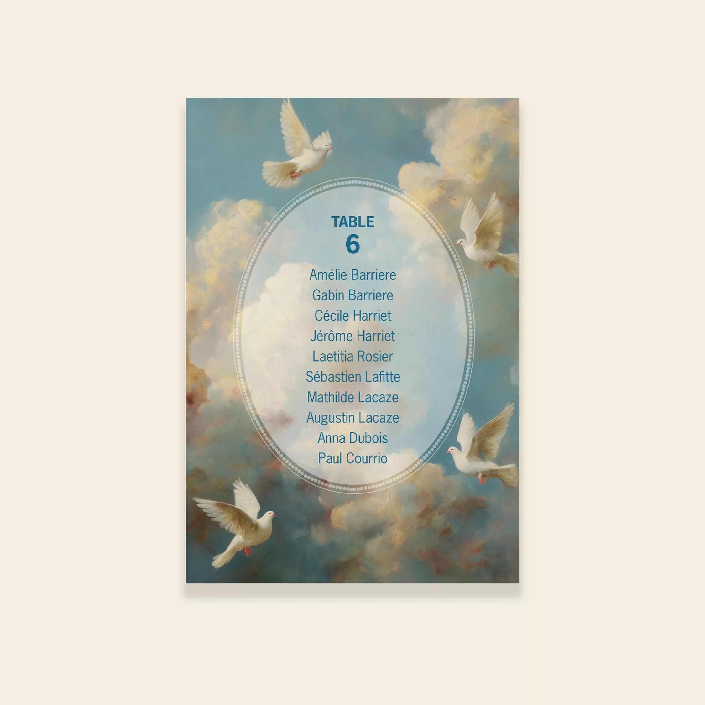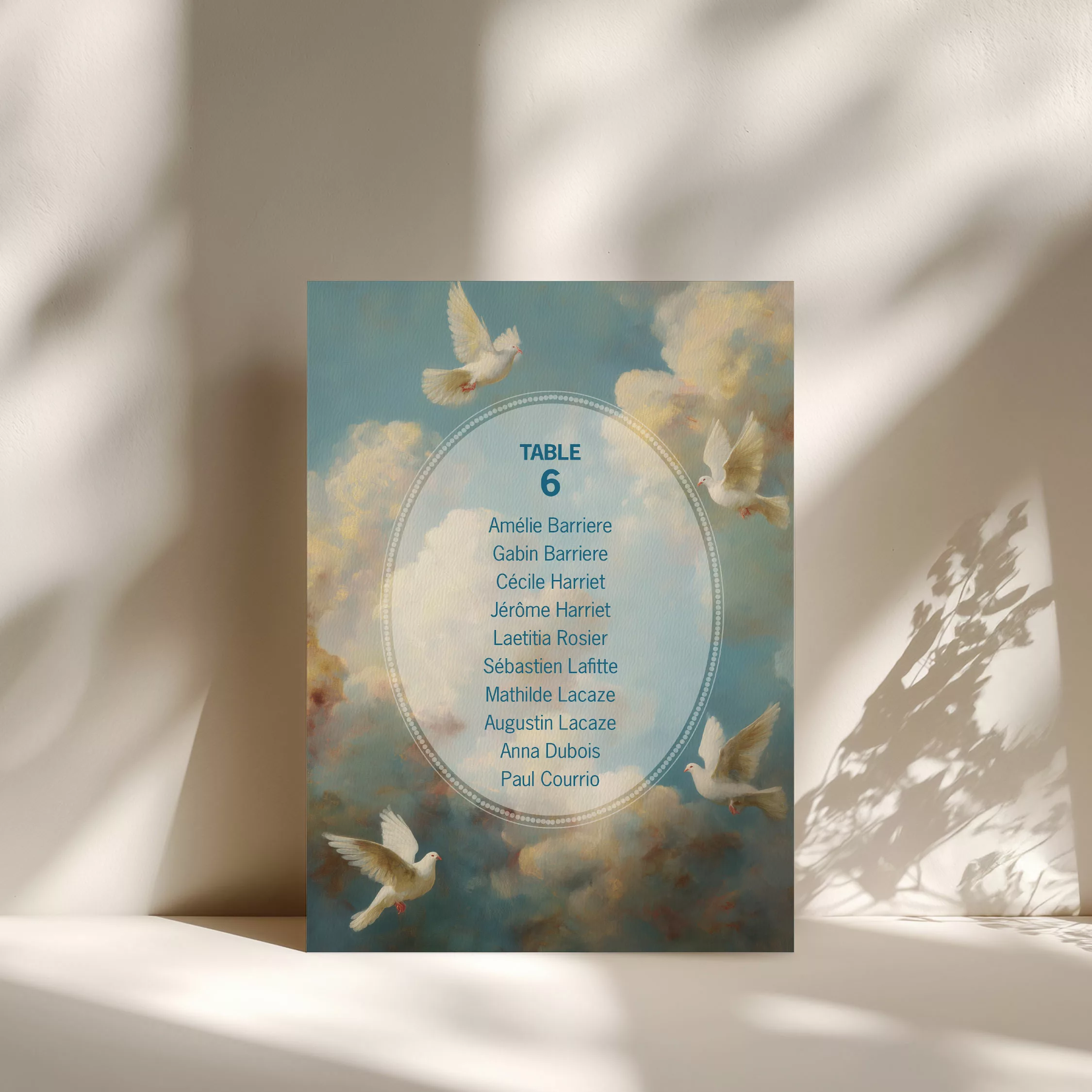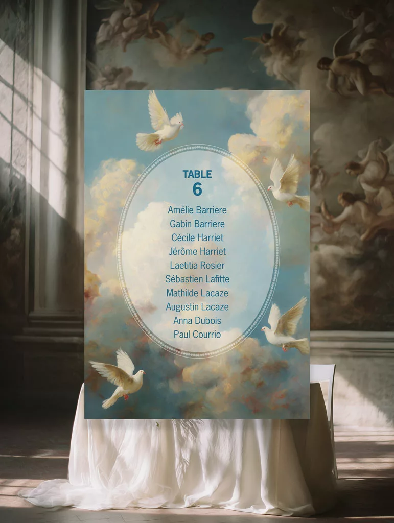 Organisez l’accueil de vos invités avec élégance grâce à nos plans de table personnalisés, conçus pour harmoniser votre décoration et guider chacun avec style lors de votre grand jour. La collection Sixtine s’inspire de l’esthétique Renaissance. Elle réunit des ciels peints, des nuages vaporeux et une lumière céleste qui crée une atmosphère douce et onirique. Maison Célestine y explore un univers audacieux, où les fresques anciennes dialoguent avec une vision plus contemporaine. Chaque création ouvre une parenthèse suspendue : une invitation à s’élever, à contempler et à célébrer le mariage comme une scène picturale.