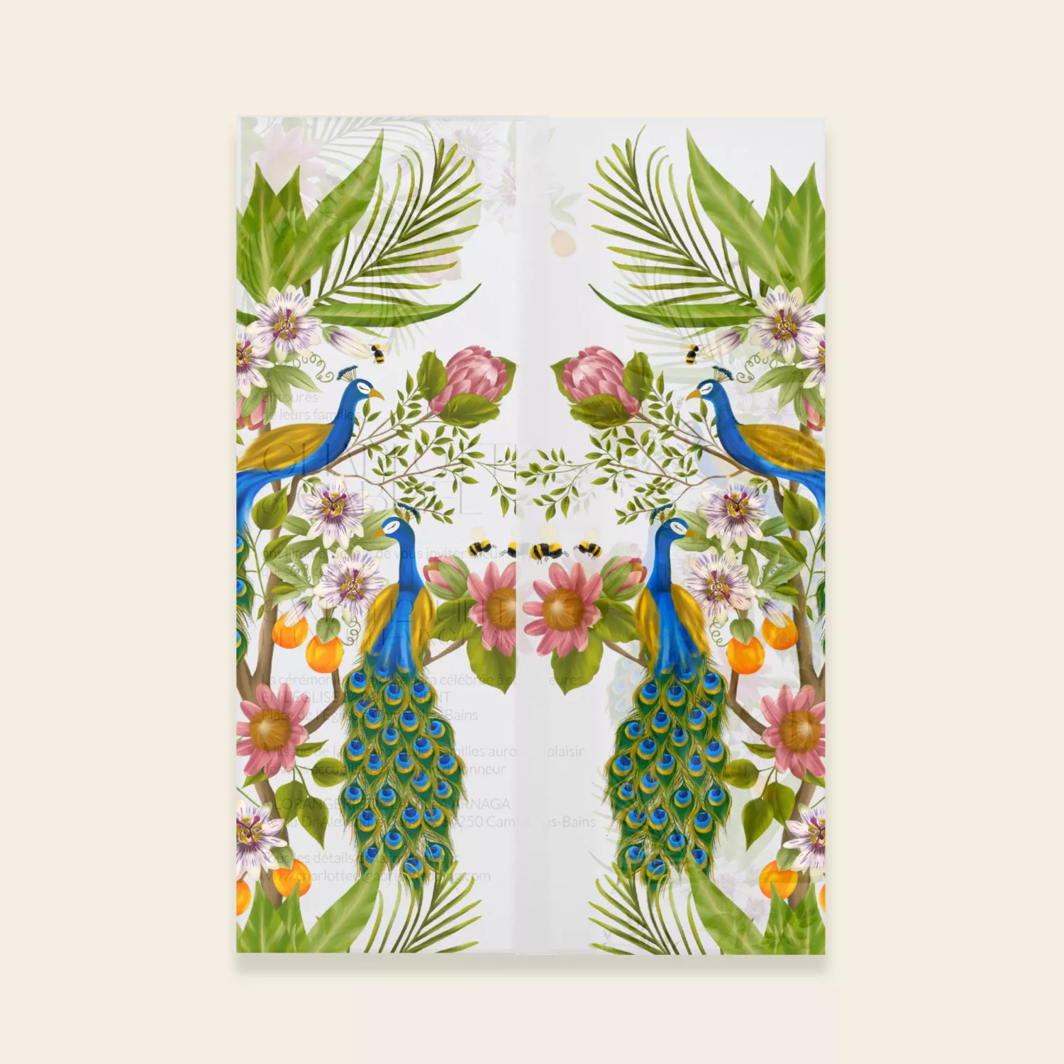 Pochette Calque de la collection PEACOCK GARDEN issue de la gamme mariage du studio. « Peacock Garden » est une collection inspirée de paysages anciens. Cette invitation au voyage au coeur du jardin des paons, cet animal majestueux aux plumes bleues originaire de l’Inde, est l’occasion de se plonger dans un univers exotique et élégant. Donnez le ton avec cette papeterie de mariage ou faune et flore se mélangent pour une célébration à la fois chic et intemporelle. Peacock Garden est un véritable voyage illustré qui transportera vos invités et qui restera un beau symbole de votre union. Cette collection, entièrement peinte à la main par la créatrice est idéale pour les mariages à l’esprit nature, moderne et élégant.