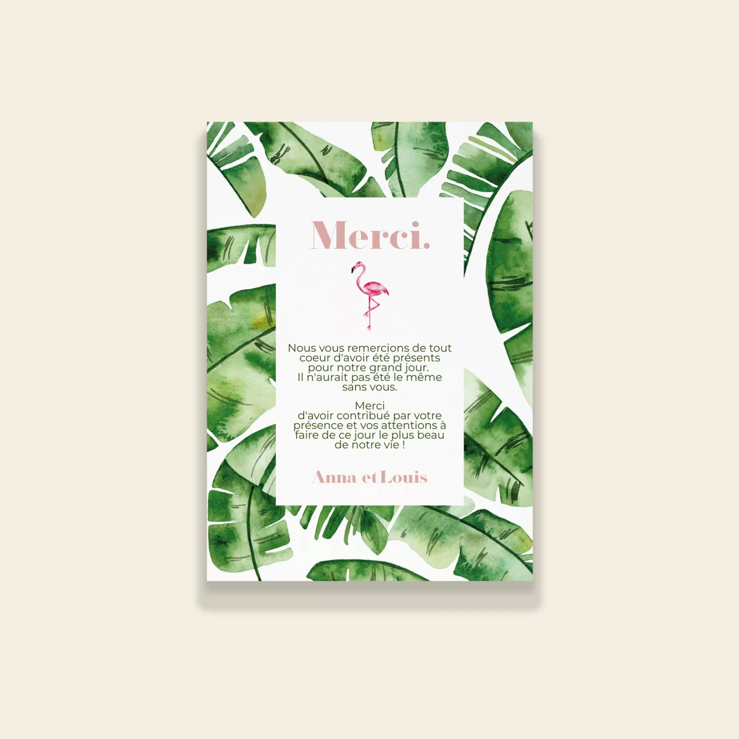 Remerciements de mariage de la collection BANANA LIFE issue de la gamme mariage du studio. « Banana Life » s’inspire d’un univers tropical et exotique. La végétation est rehaussée par des touches de rose. Les feuilles de bananiers sont mixées avec une écriture graphique pour une papeterie moderne et tendance. Cette collection, entièrement peinte à la main par la créatrice est idéale pour les mariages à l’esprit d’évasion, bohème et éclectique.