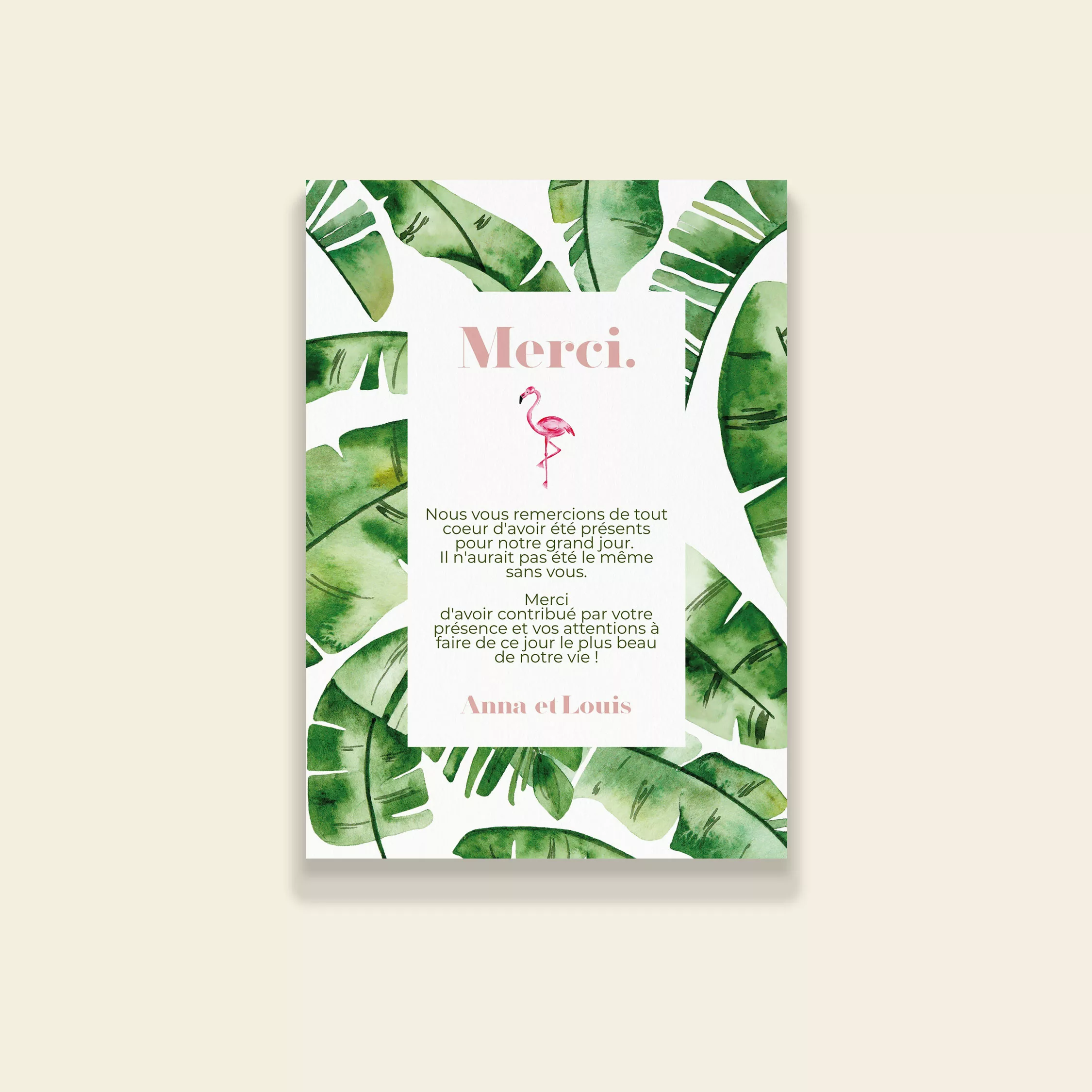 Remerciements de mariage de la collection BANANA LIFE issue de la gamme mariage du studio. « Banana Life » s’inspire d’un univers tropical et exotique. La végétation est rehaussée par des touches de rose. Les feuilles de bananiers sont mixées avec une écriture graphique pour une papeterie moderne et tendance. Cette collection, entièrement peinte à la main par la créatrice est idéale pour les mariages à l’esprit d’évasion, bohème et éclectique.