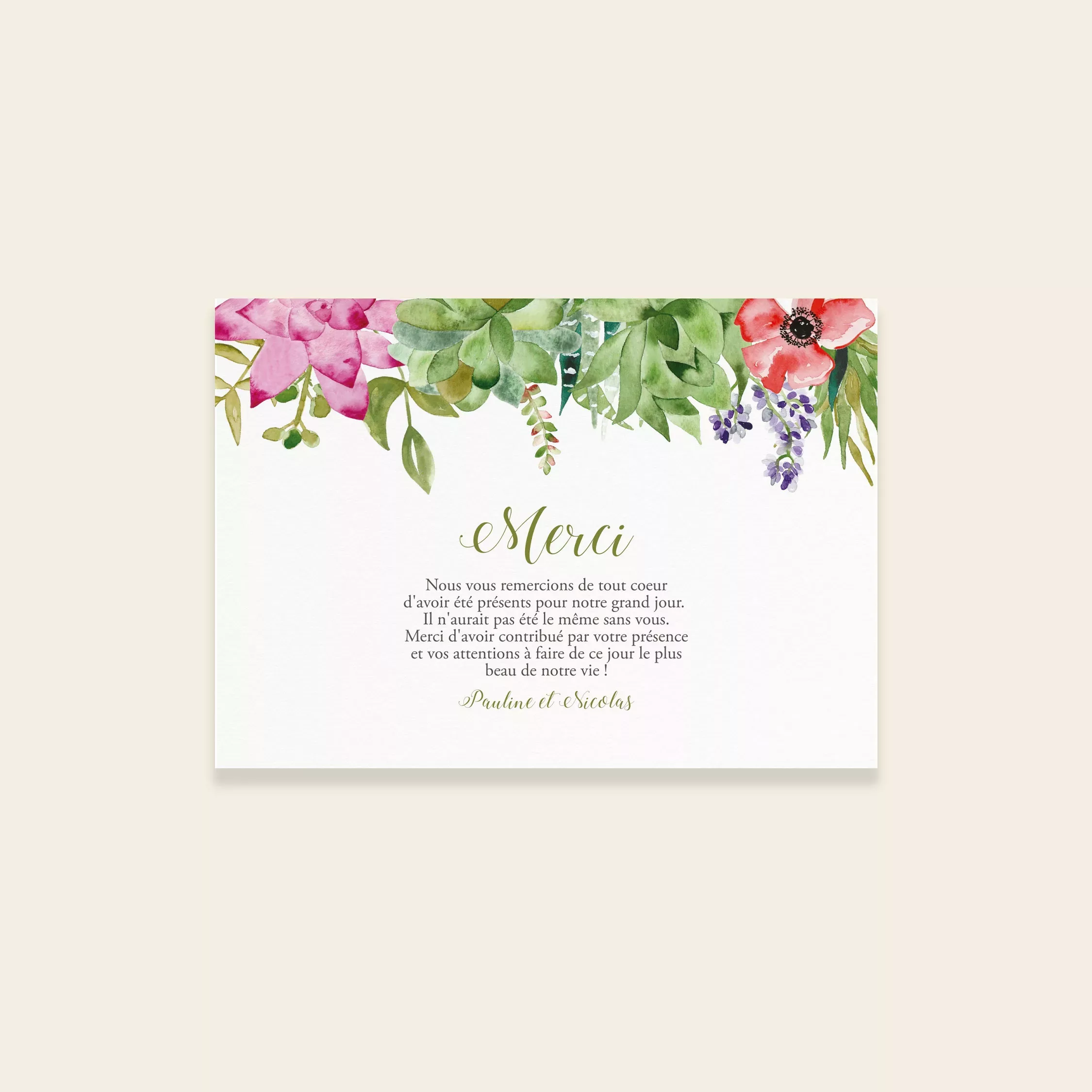 Remerciements de mariage de la collection SUCCULENTES issue de la gamme mariage de Maison Célestine. “Succulentes” est un design botanique, entièrement peint à la main à l’aquarelle au studio. Une papeterie mettant en scène des succulentes et autres plantes grasses mêlant divers feuillages, couleurs et fleurs. Une papeterie colorée, idéale pour les mariages à l’esprit bohème et nature.