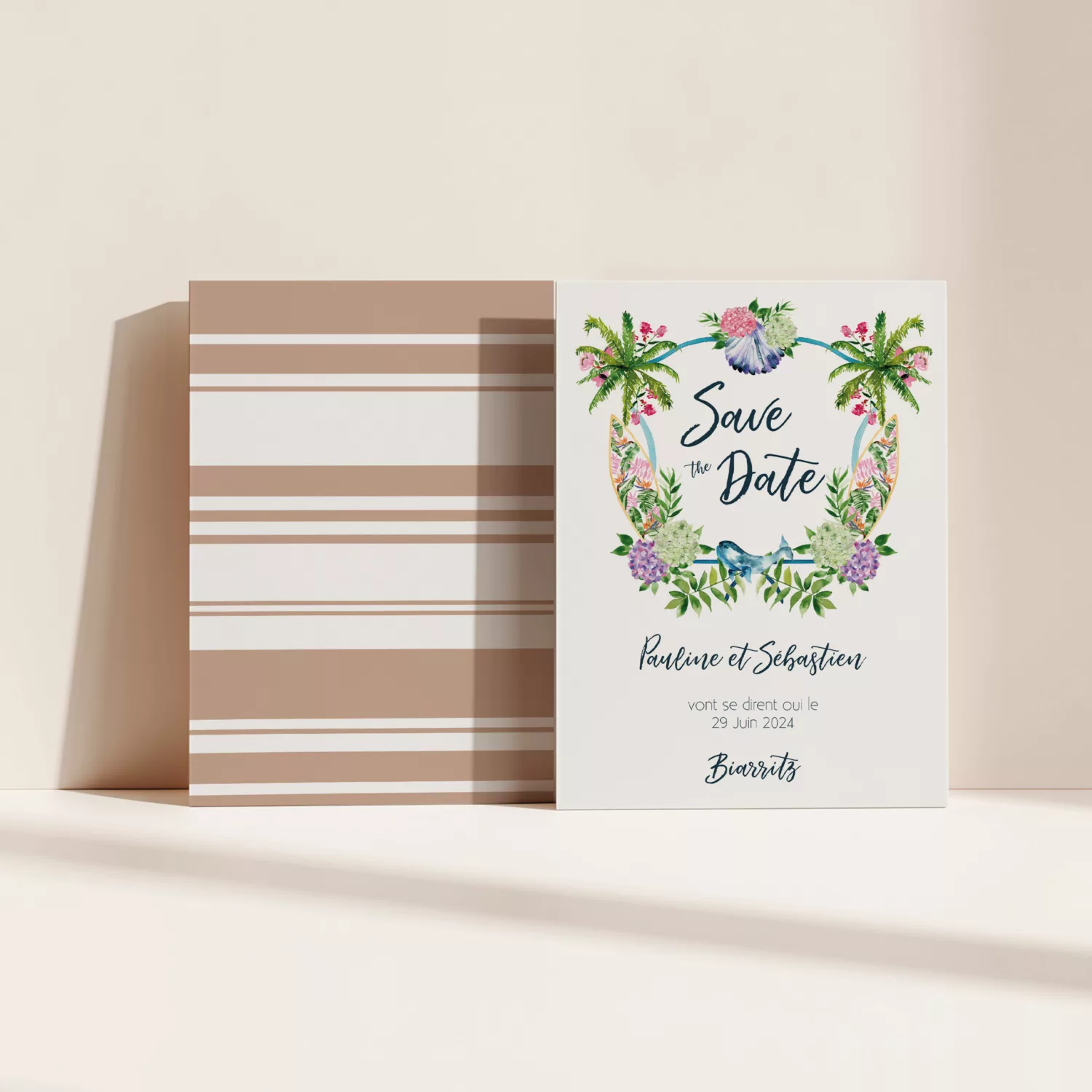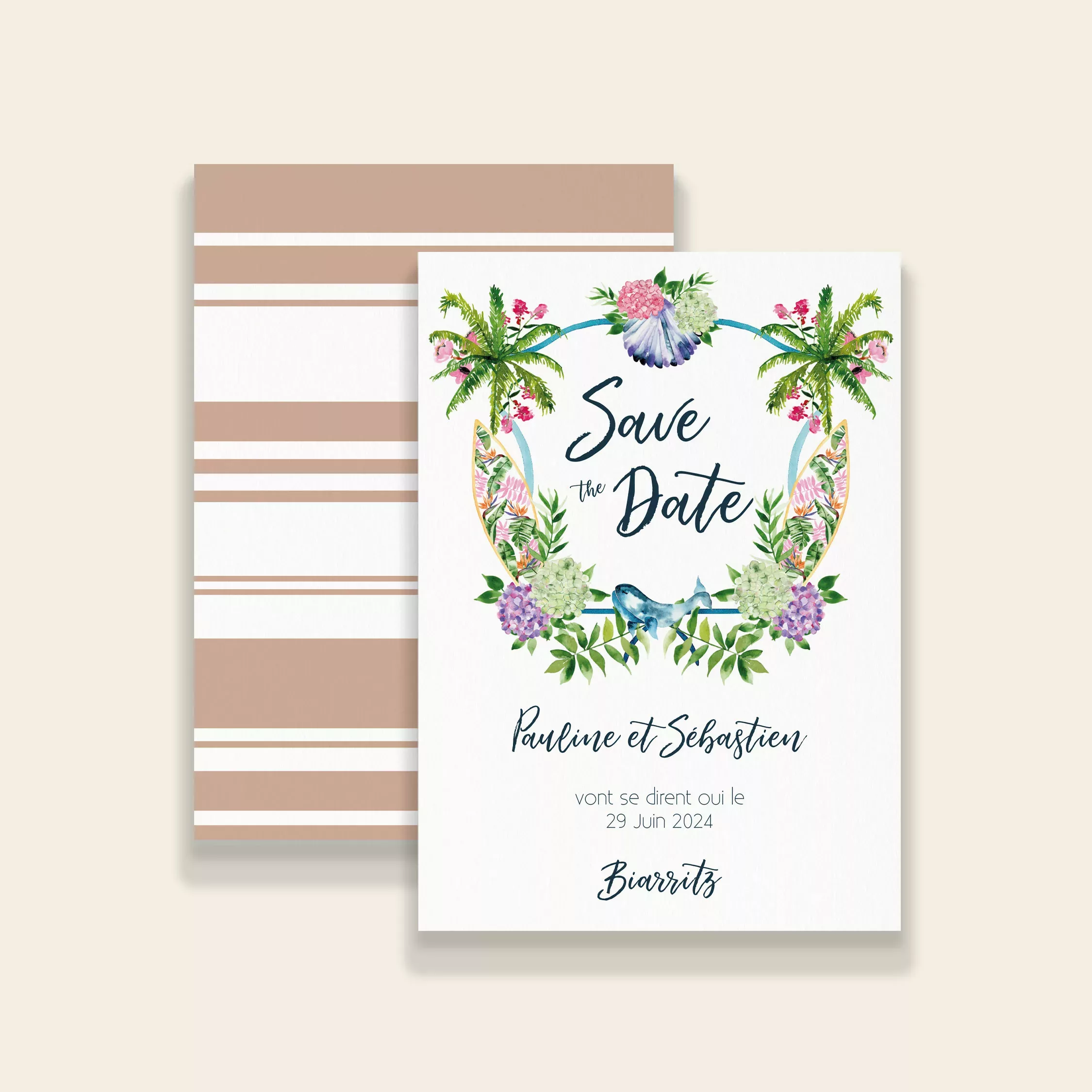 Le Save the Date permet d’annoncer votre mariage et de prévenir vos proches bien en amont. Le studio se charge de la personnalisation pour que chaque détail soit en parfaite cohérence avec votre papeterie. La collection « Biarritz » de Maison Célestine célèbre la ville natale de la créatrice. Elle reflète l’ambiance unique de cette station balnéaire. Chaque création met en avant ses emblèmes : les tentes de la Grande Plage, les hortensias, une baleine, des planches de surf ou encore les palmiers. Pour compléter ces illustrations, un imprimé à rayures s’inspire du linge basque traditionnel. Cette touche apporte couleur et raffinement à vos faire-parts.