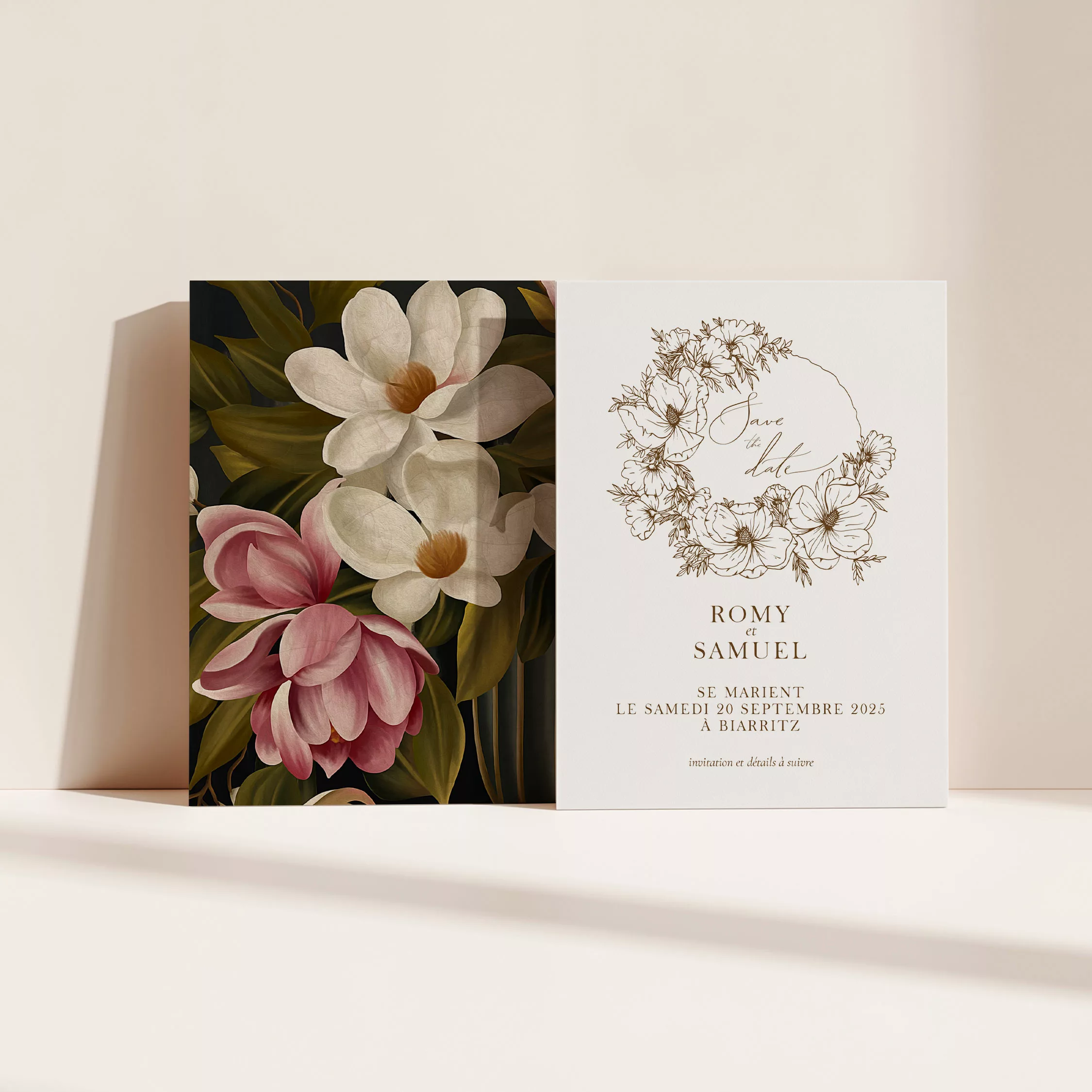 Le Save the Date permet d’annoncer votre mariage et de prévenir vos proches bien en amont. Le studio se charge de la personnalisation pour que chaque détail soit en parfaite cohérence avec votre papeterie. La collection « Magnolia Antica » de Maison Célestine vous invite à célébrer votre mariage avec raffinement et délicatesse. Inspirée par la rencontre entre le charme ancien et la modernité, cette papeterie met en lumière la beauté des magnolias à travers des illustrations soigneusement réalisées. Ainsi, chaque création reflète à la fois élégance et authenticité.