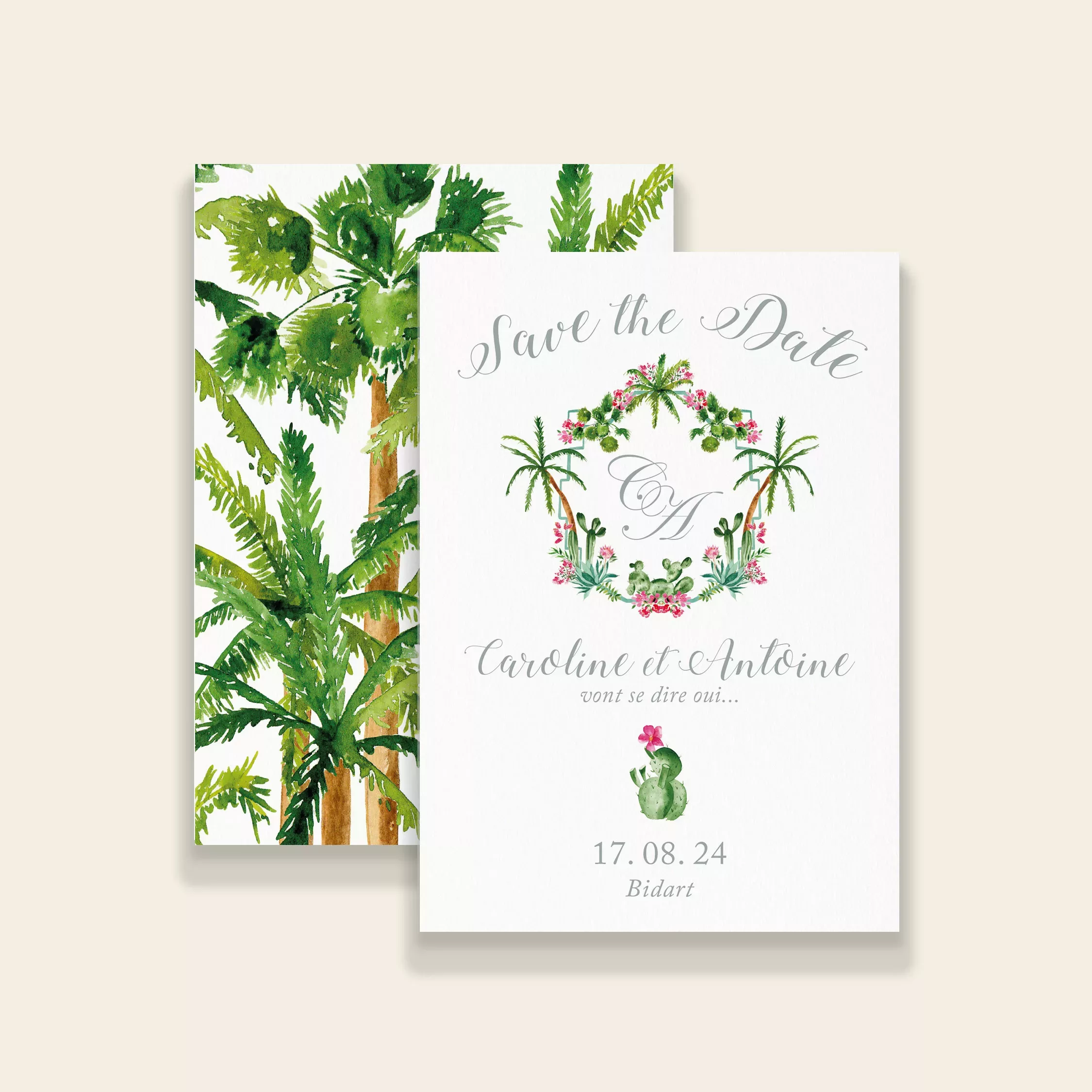 De plus, la collection se distingue par son blason, qui combine plantes, fleurs et initiales. Ce symbole devient le fil conducteur de votre papeterie et représente votre union de façon élégante. Cette collection s’adapte parfaitement aux mariages à l’esprit bohème, vintage ou éclectique. Elle transforme chaque élément de votre papeterie en un souvenir unique et mémorable. Vos invités seront immédiatement plongés dans l’univers Palm Springs.