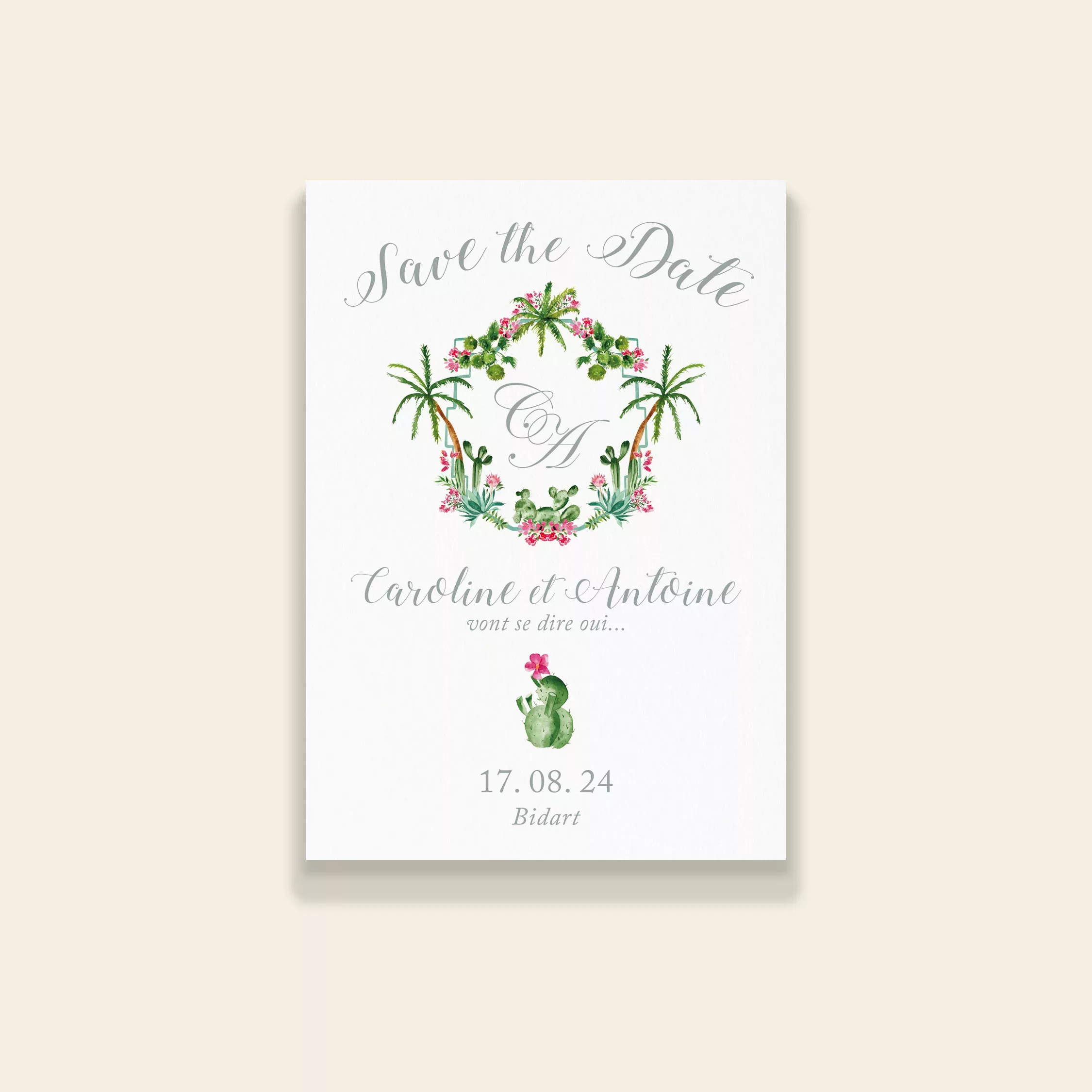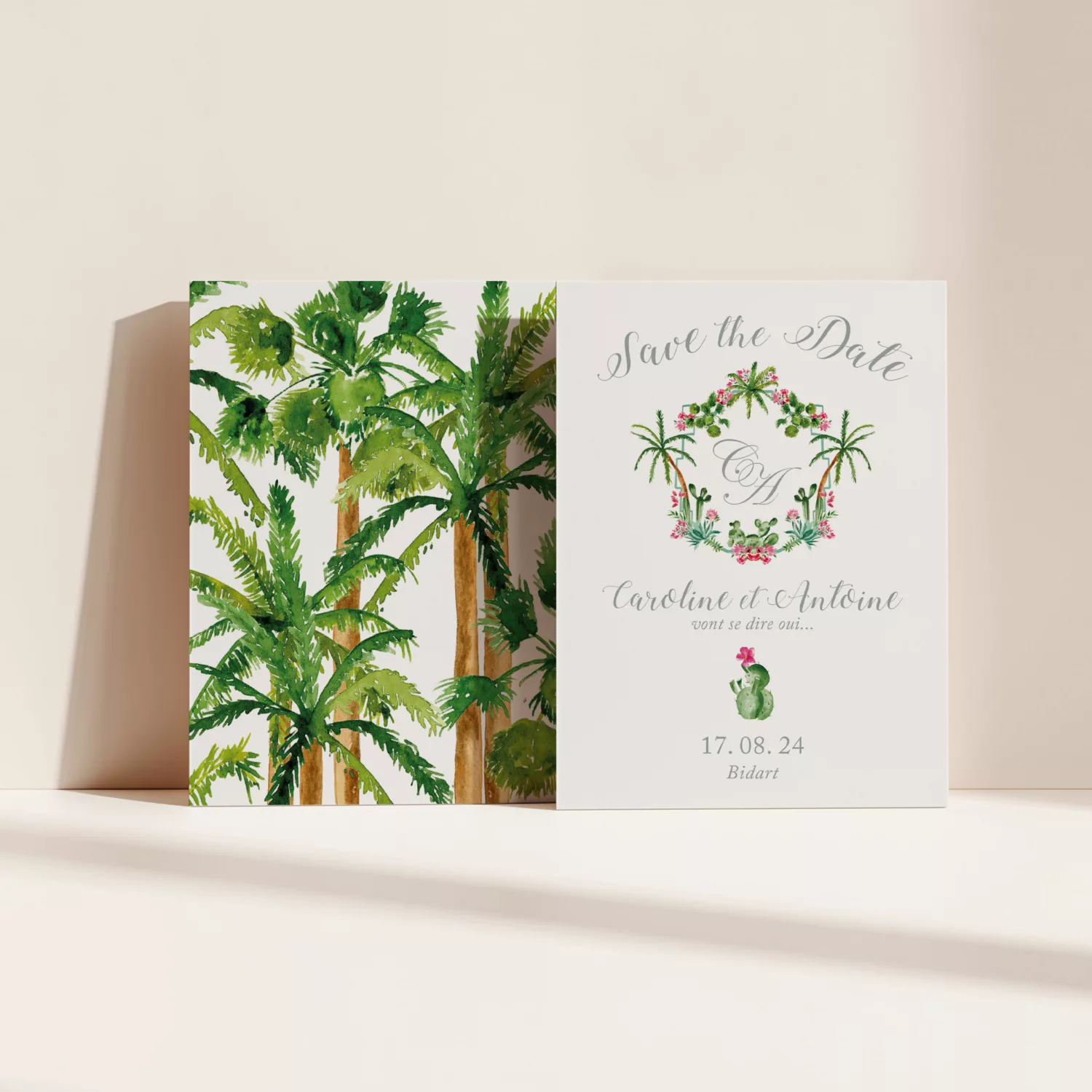 Le Save the Date permet d’annoncer votre mariage et de prévenir vos proches bien en amont. Le studio se charge de la personnalisation pour que chaque détail soit en parfaite cohérence avec votre papeterie. La collection « Palm Springs » de Maison Célestine évoque l’univers bohème et ensoleillé de Californie. Elle vous plonge dans une ambiance unique, entre palmiers majestueux et cactus typiques du désert. Ainsi, chaque création invite au voyage et au dépaysement. Les illustrations, entièrement peintes à la main par la créatrice, mêlent désert et végétation tropicale. Elles apportent une touche authentique et poétique à vos faire-part, menus et cartes de remerciement. Le style bohème se marie à des couleurs vives et à des détails raffinés pour un rendu chic et original.