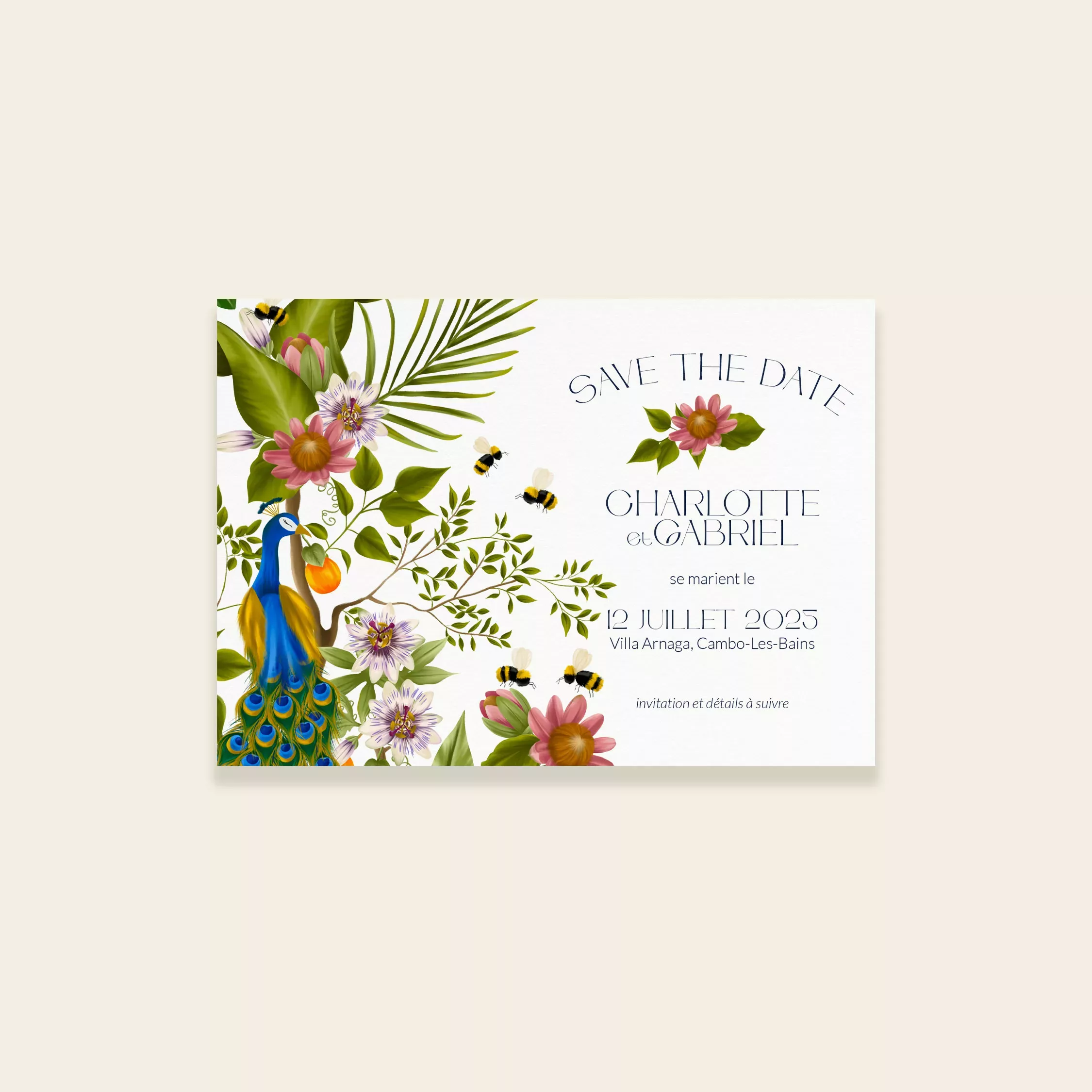 Le Save the Date permet d’annoncer votre mariage et de prévenir vos proches bien en amont. Le studio se charge de la personnalisation pour que chaque détail soit en parfaite cohérence avec votre papeterie. La collection « Peacock Garden » de Maison Célestine vous plonge dans un univers où l’exotisme rencontre l’élégance. Inspirée par la beauté vibrante des plumes de paon et des jardins luxuriants, cette papeterie de mariage crée une atmosphère colorée et raffinée. Ainsi, chaque invitation capture la magie d’un événement unique et inoubliable.