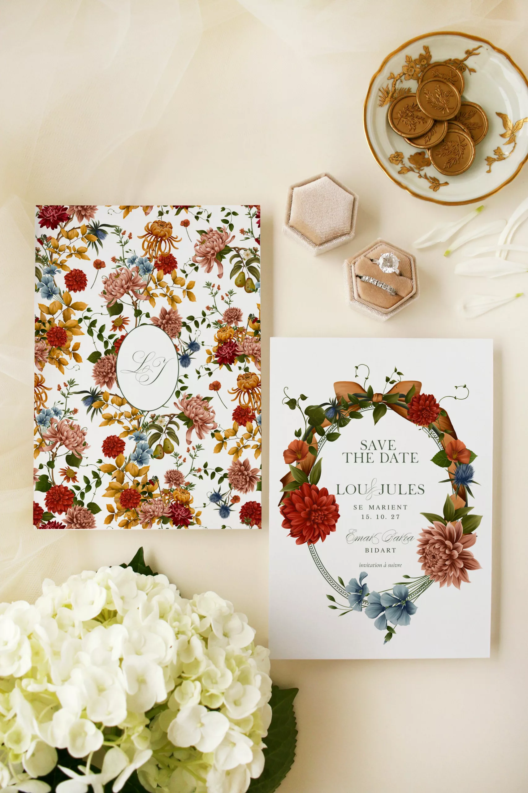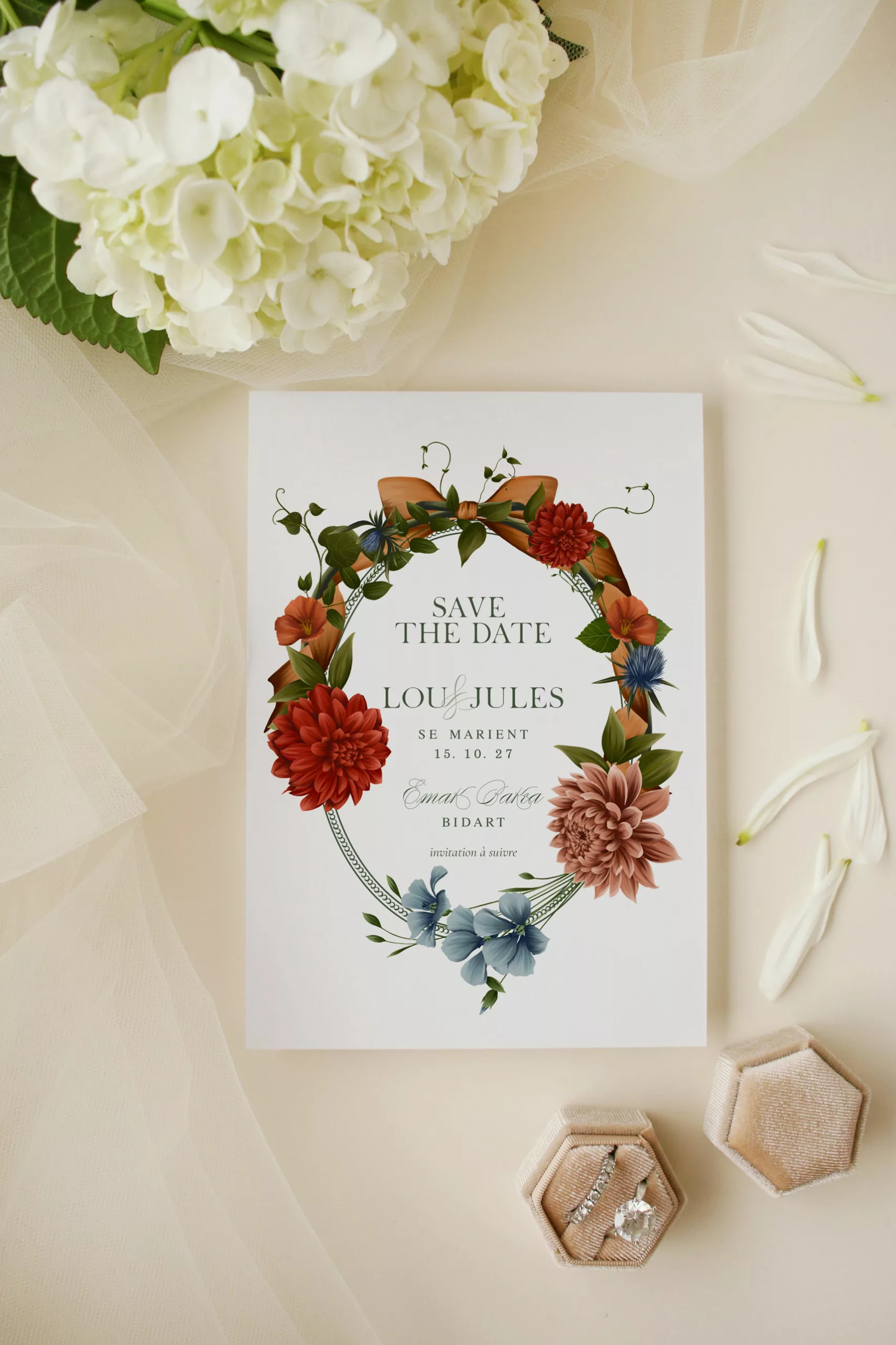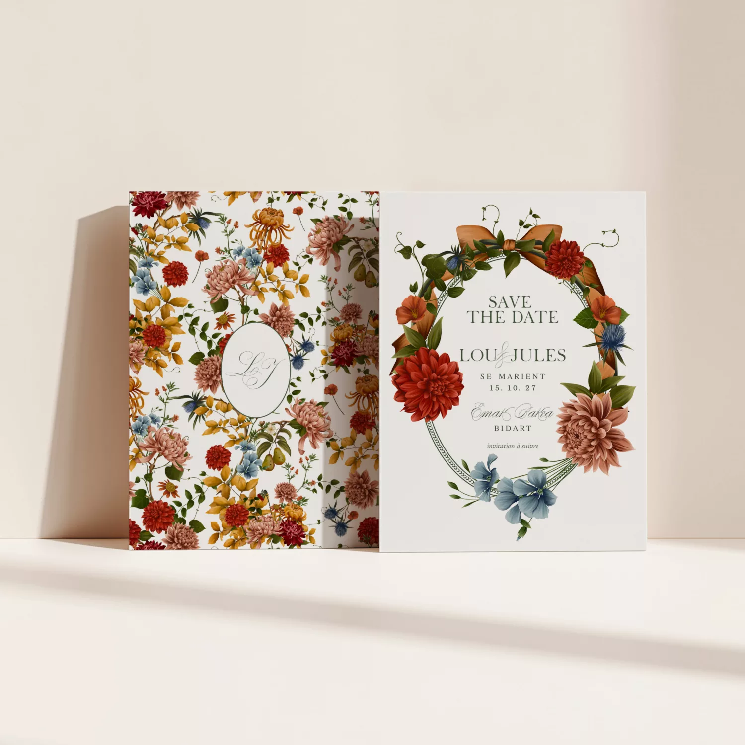 Annoncez votre mariage avec élégance grâce à ce Save the Date de mariage automnal de la collection Songes d’Automne. Inspiré par la beauté de la saison, il met à l’honneur les teintes dorées et les nuances profondes de l’automne. Fruits et feuillages se mêlent à des fleurs délicates pour composer une création à la fois naturelle et romantique. Avec ses tons orangés, vieux rose et rouge profond, ce modèle est idéal pour un mariage d’automne empreint de douceur et de caractère.