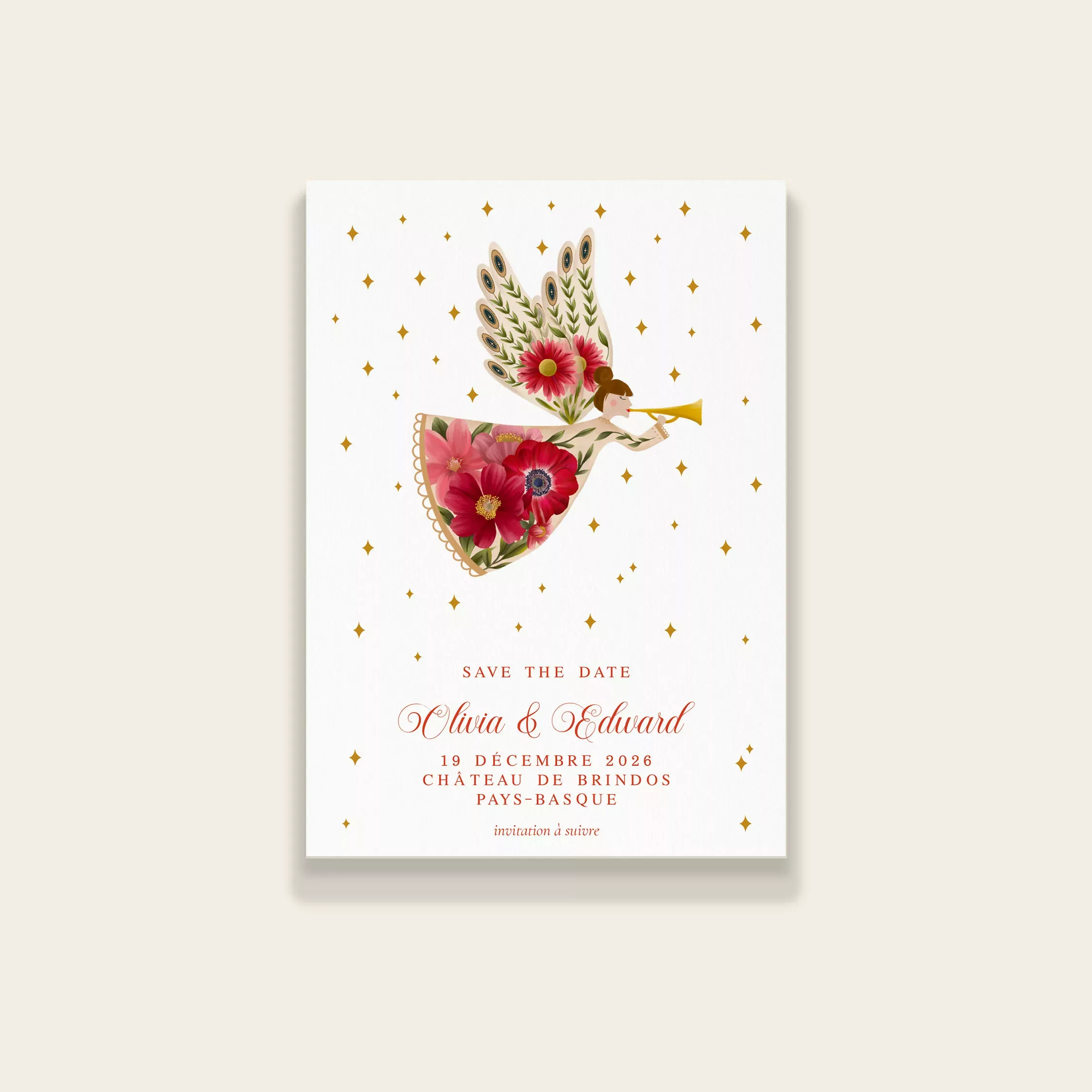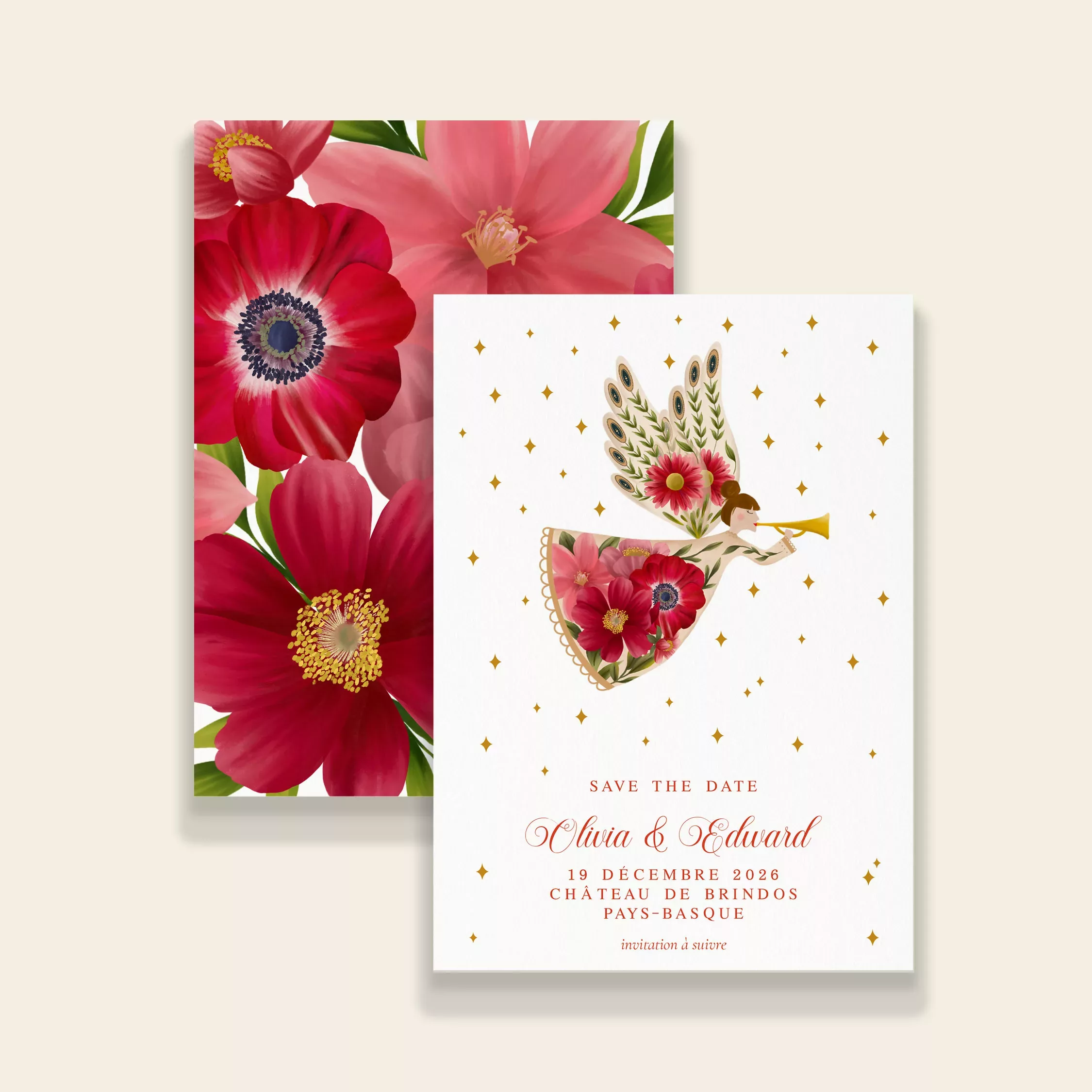 Le Save the Date permet d’annoncer votre mariage et de prévenir vos proches bien en amont. Le studio se charge de la personnalisation pour que chaque détail soit en parfaite cohérence avec votre papeterie. Incarnez votre mariage avec charme grâce à la collection « Un Conte de Noël » de Maison Célestine. Inspirée par l’hiver et les fêtes de fin d’année, cette papeterie mêle tradition et magie. Poinsettias, anges, casse-noisette et imprimés tartan apportent une atmosphère chaleureuse et festive à vos invitations.