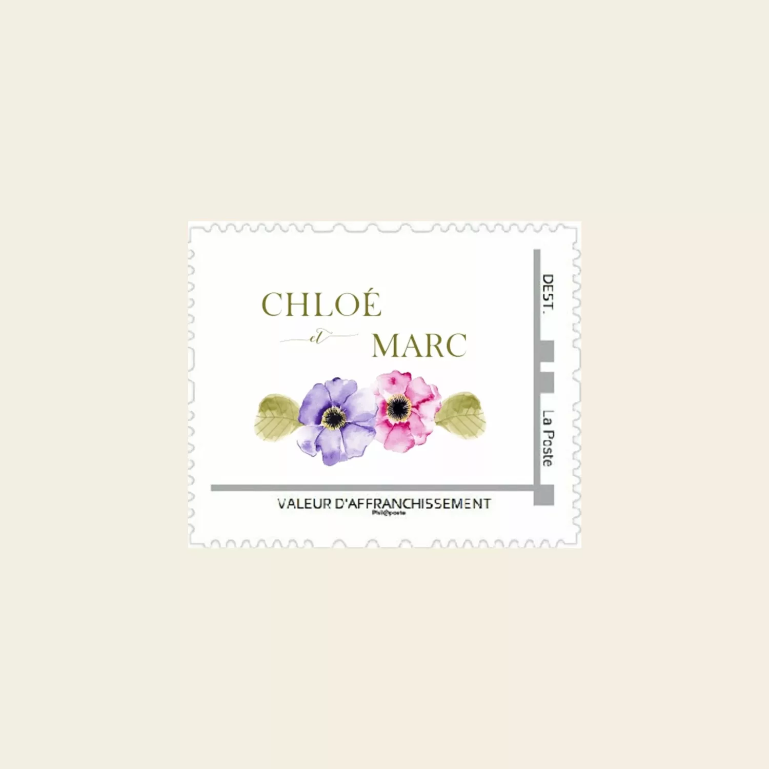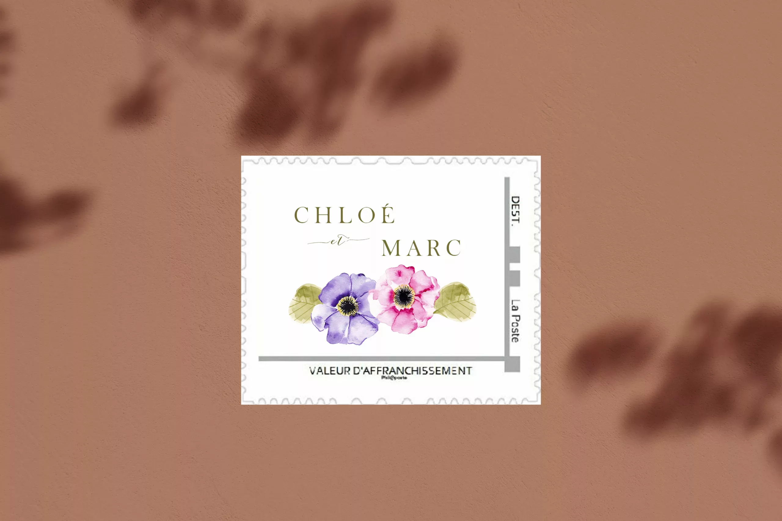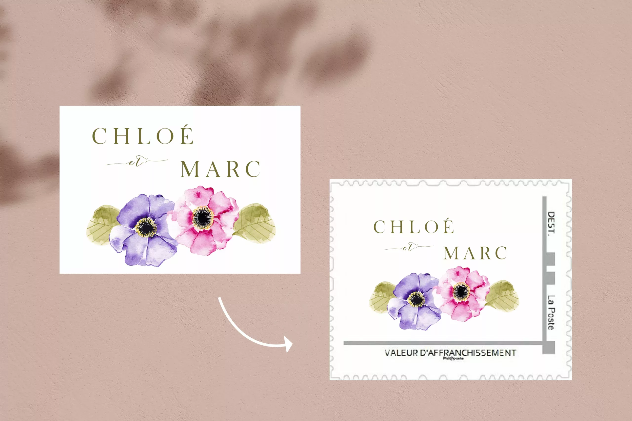 Le timbre c’est la petite touche en plus qui apportera de l’élégance à votre enveloppe. Nous vous envoyons le visuel et vous n’avez plus qu’à créer votre timbre personnalisé sur le site de La Poste.