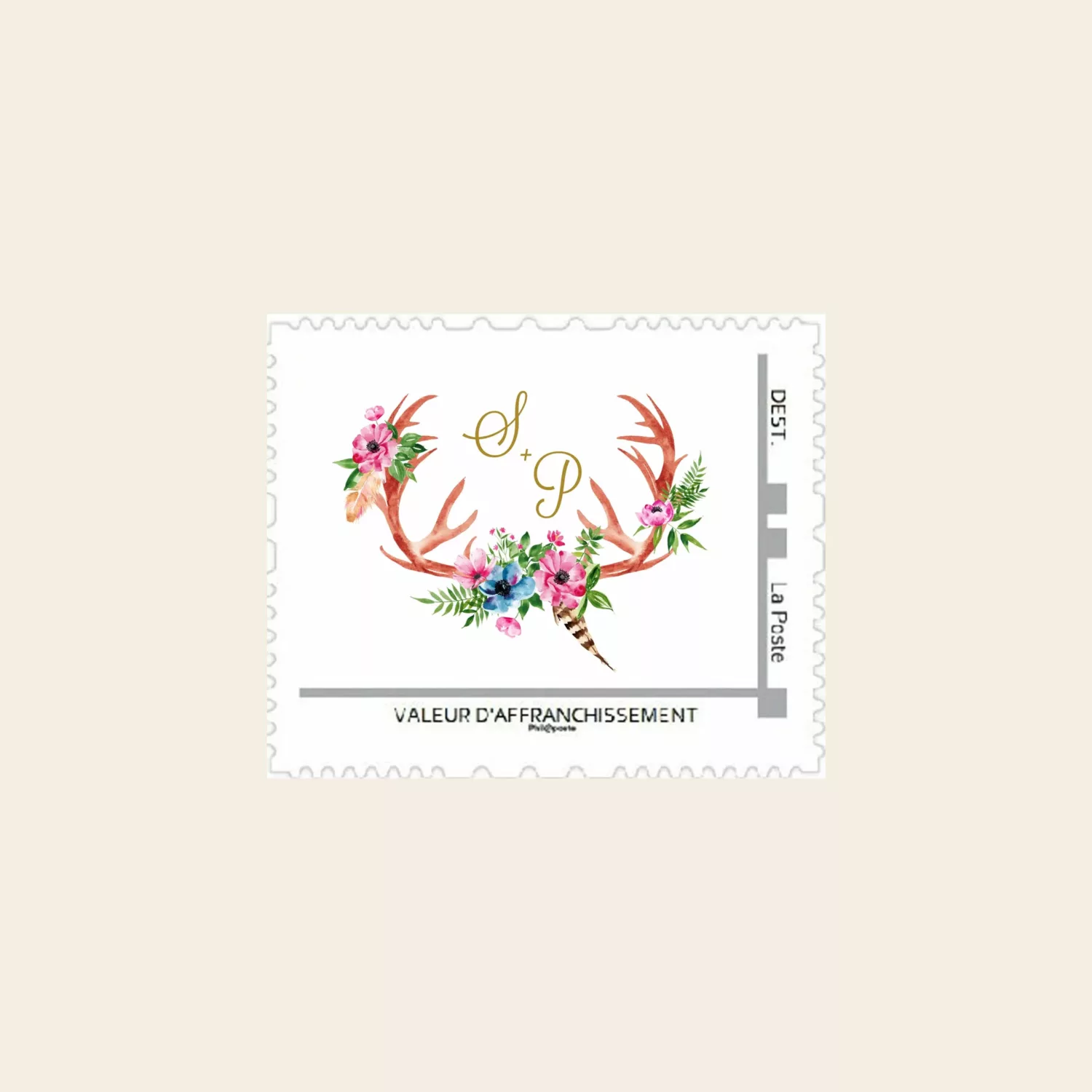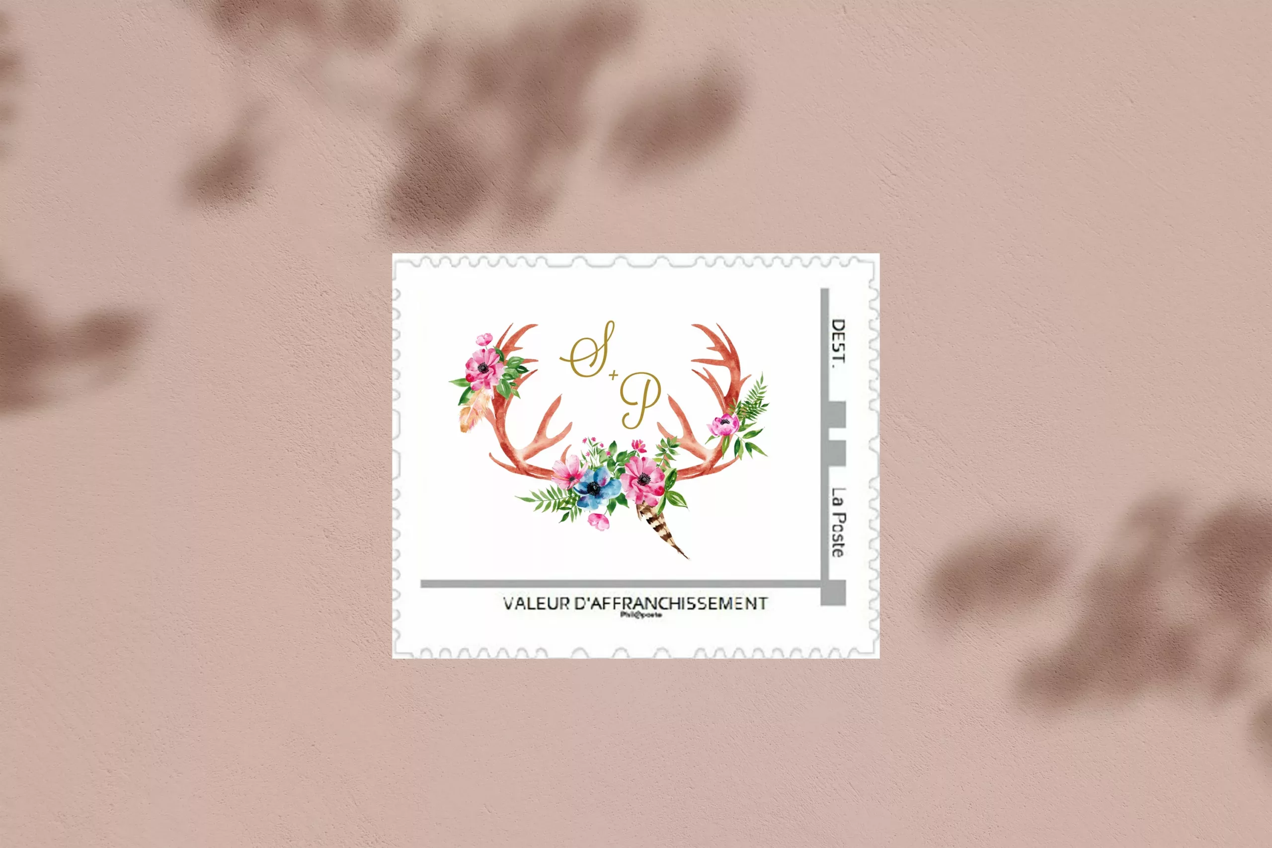 Visuel de timbre de la collection BOHOWILD issue de la gamme mariage de Maison Célestine. “Bohowild” est un design à l’esprit bohème entièrement peint à la main à l’aquarelle au studio. Cette papeterie de mariage mêle fleurs, feuillage, plumes, bois de cerf et typographie chic et romantique. C’est une collection idéale pour les mariages à l’esprit bohème et rustique.