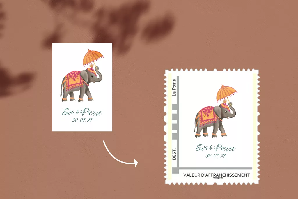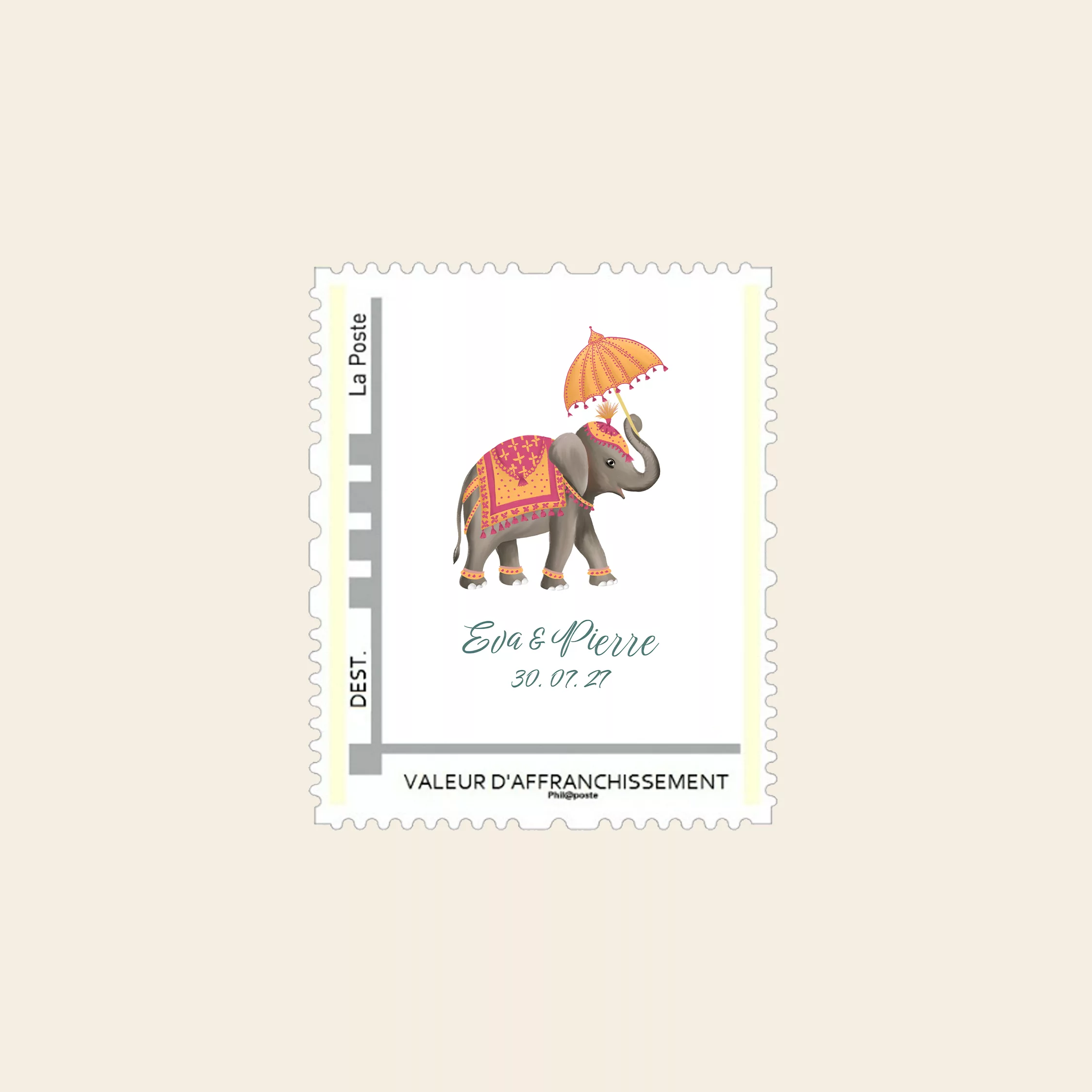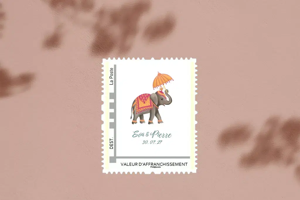 Le visuel de timbre est un fichier numérique conçu pour parfaire l’esthétique de vos enveloppes. En effet, ce visuel personnalisé aux couleurs de votre collection vous permet de commander vos propres timbres. Le studio adapte le design pour qu’il s’accorde parfaitement à votre faire-part. Ainsi, vous profitez d’une papeterie harmonieuse jusque dans les moindres détails. La collection Jaipur apporte de l’éclat à votre mariage. En effet, ce modèle s’inspire des jardins orientaux et des fêtes traditionnelles. Il combine des fleurs luxuriantes avec des éléphants de parade. De plus, des détails fantaisistes créent un ensemble harmonieux. Les nuances de rose et de jaune safran diffusent une énergie solaire. Ainsi, votre papeterie devient une véritable invitation au voyage.