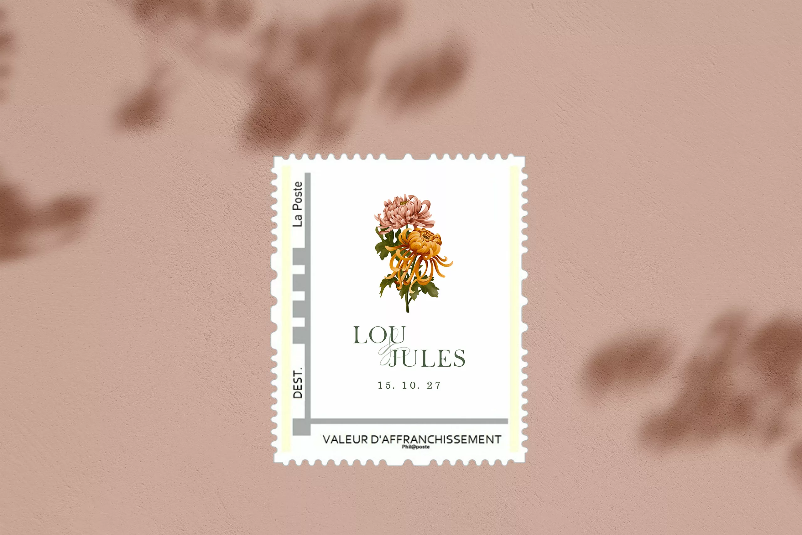 Apportez une touche d’élégance jusque sur vos enveloppes grâce au visuel de timbre de la collection Songes d’Automne. Inspiré par la beauté de cette saison, ce design raffiné s’harmonise parfaitement avec votre papeterie de mariage. Délicat et lumineux, il ajoute une note poétique à votre courrier. Ce visuel vous permet de commander vos timbres personnalisés directement auprès du service d’impression de La Poste, pour une finition soignée et en accord avec votre univers.
