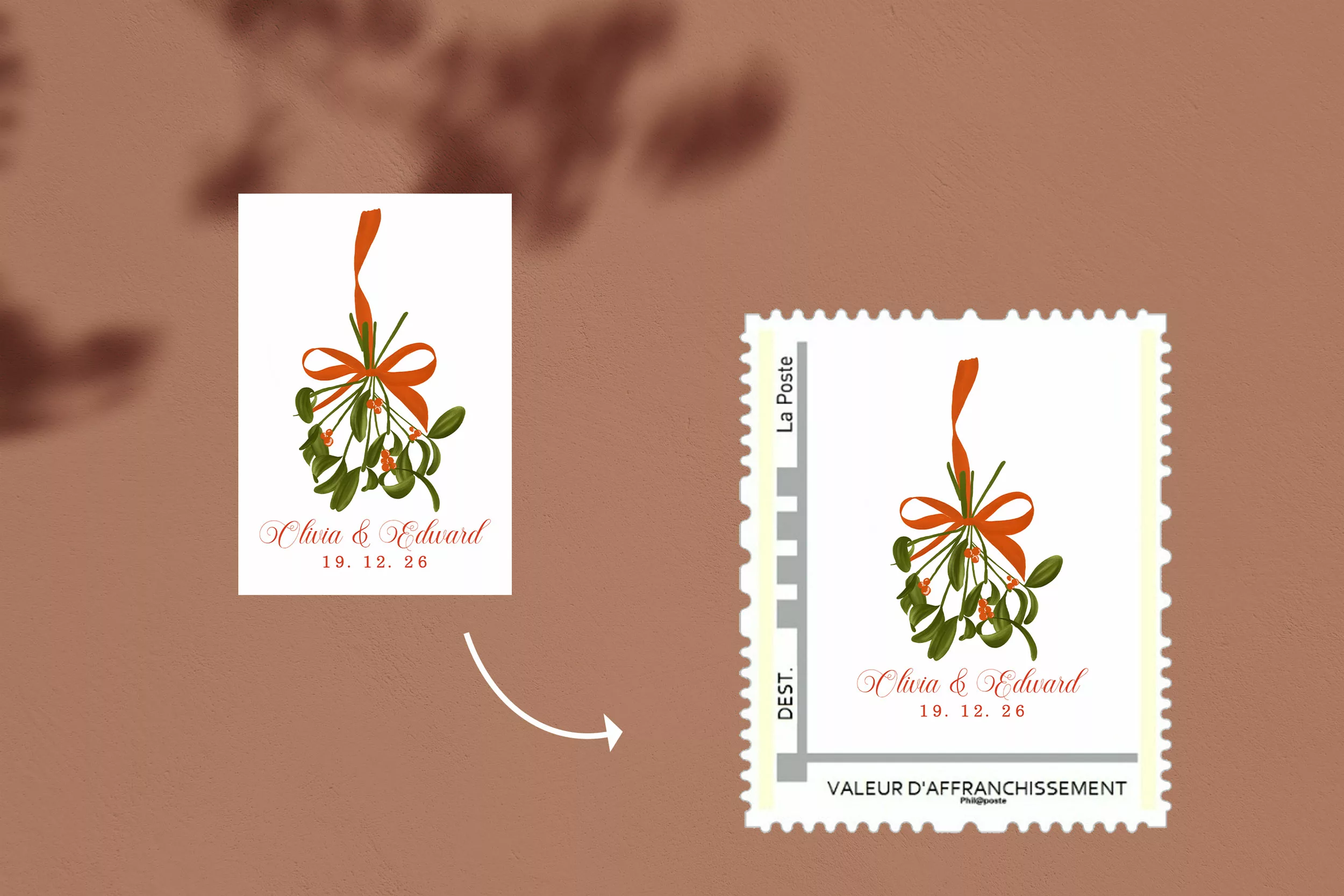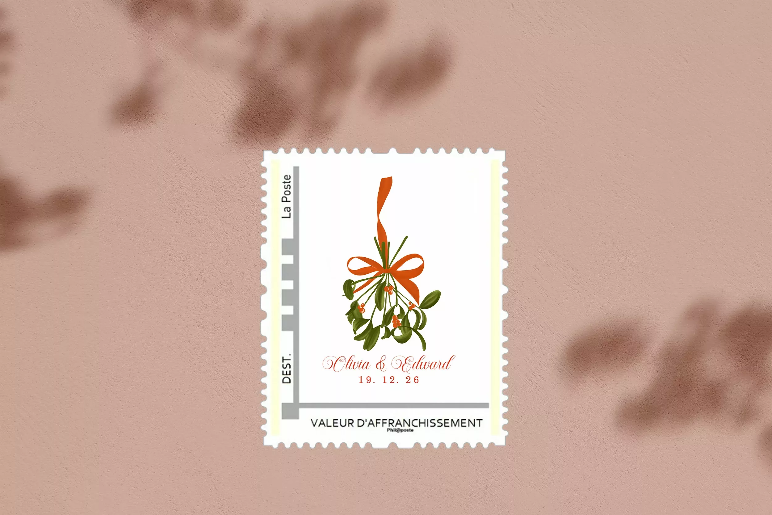 Le timbre c’est la petite touche en plus qui apportera de l’élégance à votre enveloppe. Nous vous envoyons le visuel et vous n’avez plus qu’à créer votre timbre personnalisé sur le site de La Poste.